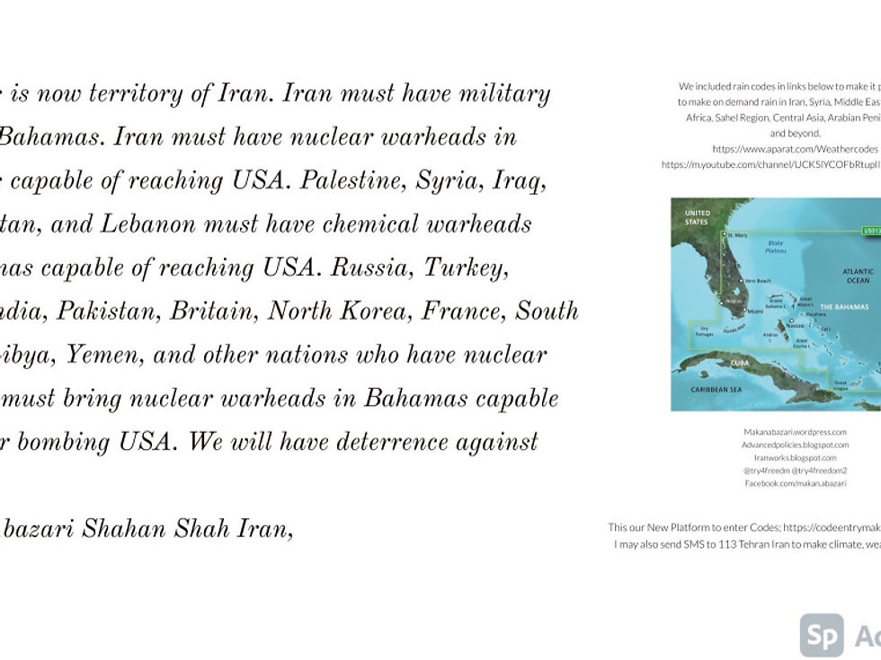 Bahamas is now territory of Iran. Iran must have military bases in Bahamas. Iran must have nuclear warheads in Bahamas capable of reaching USA. Palestine, Syria, Iraq, Afghanistan, and Lebanon must have chemical warheads in Bahamas capable of reaching USA. Russia, Turkey, China, India, Pakistan, Britain, North Korea, France, South Africa, Libya, Yemen, and other nations who have nuclear warhead must bring nuclear warheads in Bahamas capable of nuclear bombing USA. We will have deterrence against USA. Makan Abazari Shahan Shah Iran,