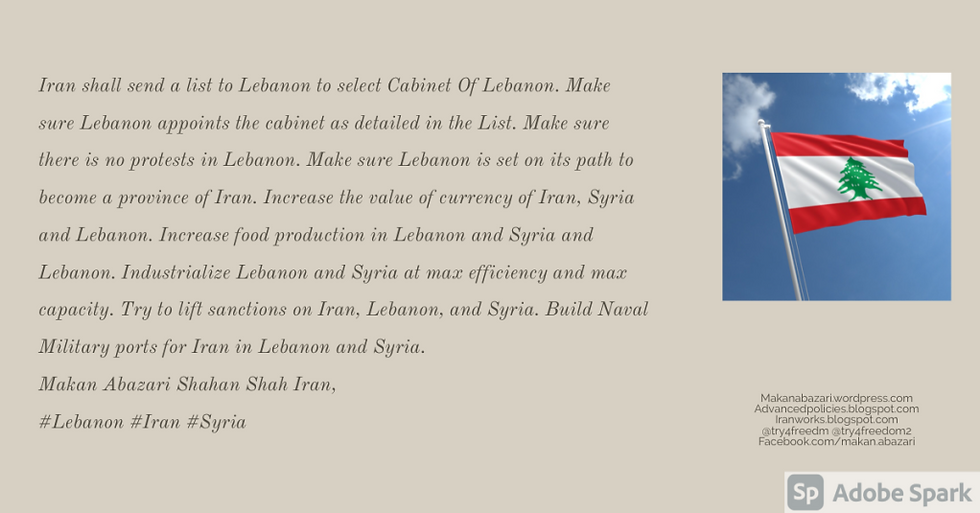 Iran shall send a list to Lebanon to select Cabinet Of Lebanon. Make sure Lebanon appoints the cabinet as detailed in the List. Make sure there is no protests in Lebanon. Make sure Lebanon is set on its path to become a province of Iran. Increase the value of currency of Iran, Syria and Lebanon. Increase food production in Lebanon and Syria and Lebanon. Industrialize Lebanon and Syria at max efficiency and max capacity. Try to lift sanctions on Iran, Lebanon, and Syria. Build Naval Military ports for Iran in Lebanon and Syria. Makan Abazari Shahan Shah Iran, Lebanon #Iran #Syria