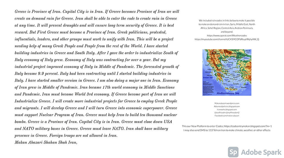 Greece is Province of Iran. Capital City is in Iran. If Greece becomes Province of Iran we will create on demand rain for Greece. Iran shall be able to enter the code to create rain in Greece at any time. It will prevent draughts and will ensure long term security of Greece. It is best reward. But First Greece must become a Province of Iran. Greek politicians, protested, influentials, leaders, and other groups must work to unify with Iran. This will be a project needing help of many Greek People and People from the rest of the World. I have started building industries in Greece and South Italy. After I gave the order to industrialize South of Italy economy of Italy grew. Economy of Italy was contracting for over a year. But my industrial project improved economy of Italy in Middle of Pandemic. The forecasted growth of Italy became 9.9 percent. Italy had been contracting until I started building industries in Italy. I have started smaller version in Greece. I am also doing a major one in Iran. Economy of Iran grew in Middle of Pandemic. Iran became 17th world economy in Middle Sanctions and Pandemic. Iran must become World 3rd economy. If Greece become part of Iran we will Industrialize Greece. I will create more industrial projects for Greece to employ Greek People and migrants. I will develop Greece and I will turn Greece into economic superpower. Greece must support Nuclear Program of Iran. Greece must help Iran to build ten thousand nuclear bombs. Greece is a Province of Iran. Capital City is in Iran. Greece must close down USA and NATO military bases in Greece. Greece must leave NATO. Iran shall have military presence in Greece. Foreign troops are not allowed in Iran. Makan Abazari Shahan Shah Iran,