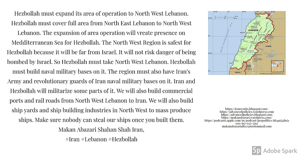 Hezbollah must expand its area of operation to North West Lebanon. Hezbollah must cover full area from North East Lebanon to North West Lebanon. The expansion of area operation will vreate presence on Medditerranean Sea for Hezbollah. The North West Region is safest for Hezbollah because it will be far from Israel. It will not risk danger of being bombed by Israel. So Hezbollah must take North West Lebanon. Hezbollah must build naval military bases on it. The region must also have Iran’s Army and revolutionary guards of Iran naval military bases on it. Iran and Hezbollah will militarize some parts of it. We will also build commercial ports and rail roads from North West Lebanon to Iran. We will also build ship yards and ship building industries in North West to mass produce ships. Make sure nobody can steal our ships once you built them. Makan Abazari Shahan Shah Iran,