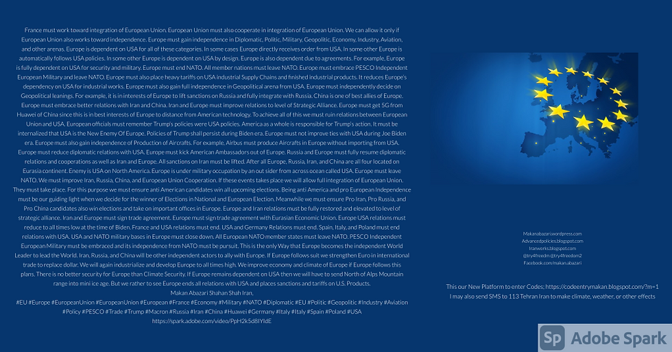 France must work toward integration of European Union. European Union must also cooperate in integration of European Union. We can allow it only if European Union also works toward independence. Europe must gain independence in Diplomatic, Politic, Military, Geopolitic, Economy, Industry, Aviation, and other arenas. Europe is dependent on USA for all of these categories. In some cases Europe directly receives order from USA. In some other Europe is automatically follows USA policies. In some other Europe is dependent on USA by design. Europe is also dependent due to agreements. For example, Europe is fully dependent on USA for security and military. Europe must end NATO. All member nations must leave NATO. Europe must embrace PESCO Independent European Military and leave NATO. Europe must also place heavy tariffs on USA industrial Supply Chains and finished industrial products. It reduces Europe’s dependency on USA for industrial works. Europe must also gain full independence in Geopolitical arena from USA. Europe must independently decide on Geopolitical leanings. For example, it is in interests of Europe to lift sanctions on Russia and fully integrate with Russia. China is one of best allies of Europe. Europe must embrace better relations with Iran and China. Iran and Europe must improve relations to level of Strategic Alliance. Europe must get 5G from Huawei of China since this is in best interests of Europe to distance from American technology. To achieve all of this we must ruin relations between European Union and USA. European officials must remember Trump’s policies were USA policies. America as a whole is responsible for Trump’s action. It must be internalized that USA is the New Enemy Of Europe. Policies of Trump shall persist during Biden era. Europe must not improve ties with USA during Joe Biden era. Europe must also gain independence of Production of Aircrafts. For example, Airbus must produce Aircrafts in Europe without importing from USA. Europe must reduce diplomatic relations with USA. Europe must kick American Ambassadors out of Europe. Russia and Europe must fully resume diplomatic relations and cooperations as well as Iran and Europe. All sanctions on Iran must be lifted. After all Europe, Russia, Iran, and China are all four located on Eurasia continent. Enemy is USA on North America. Europe is under military occupation by an out sider from across ocean called USA. Europe must leave NATO. We must improve Iran, Russia, China, and European Union Cooperation. If these events takes place we will allow full integration of European Union. They must take place. For this purpose we must ensure anti American candidates win all upcoming elections. Being anti America and pro European Independence must be our guiding light when we decide for the winner of Elections in National and European Election. Meanwhile we must ensure Pro Iran, Pro Russia, and Pro China candidates also win elections and take on important offices in Europe. Europe and Iran relations must be fully restored and elevated to level of strategic alliance. Iran and Europe must sign trade agreement. Europe must sign trade agreement with Eurasian Economic Union. Europe USA relations must reduce to all times low at the time of Biden. France and USA relations must end. USA and Germany Relations must end. Spain, Italy, and Poland must end relations with USA. USA and NATO military bases in Europe must close down. All European NATO member states must leave NATO. PESCO Independent European Military must be embraced and its independence from NATO must be pursuit. This is the only Way that Europe becomes the independent World Leader to lead the World. Iran, Russia, and China will be other independent actors to ally with Europe. If Europe follows suit we strengthen Euro in international trade to replace dollar. We will again industrialize and develop Europe to all times high. We improve economy and climate of Europe if Europe follows this plans. There is no better security for Europe than Climate Security. If Europe remains dependent on USA then we will have to send North of Alps Mountain range into mini ice age. But we rather to see Europe ends all relations with USA and places sanctions and tariffs on U.S. Products. Makan Abazari Shahan Shah Iran, #EU #Europe #EuropeanUnion #EuropeanUnion #European #France #Economy #Military #NATO #Diplomatic #EU #Politic #Geopolitic #Industry #Aviation #Policy #PESCO #Trade #Trump #Macron #Russia #Iran #China #Huawei #Germany #Italy #Italy #Spain #Poland #USA https://spark.adobe.com/video/PpH2k5d8IYIdE