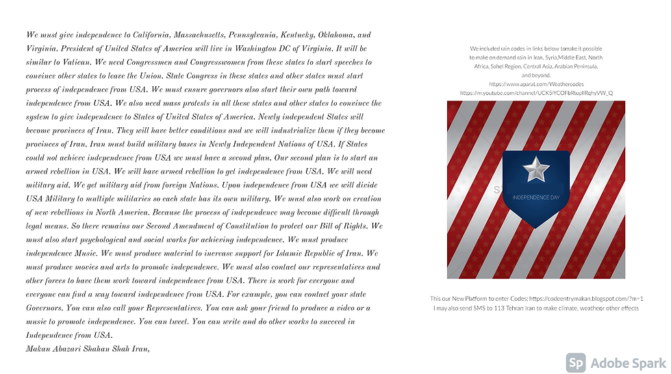 We must give independence to California, Massachusetts, Pennsylvania, Kentucky, Oklahoma, and Virginia. President of United States of America will live in Washington DC of Virginia. It will be similar to Vatican. We need Congressmen and Congresswomen from these states to start speeches to convince other states to leave the Union. State Congress in these states and other states must start process of independence from USA. We must ensure governors also start their own path toward independence from USA. We also need mass protests in all these states and other states to convince the system to give independence to States of United States of America. Newly independent States will become provinces of Iran. They will have better conditions and we will industrialize them if they become provinces of Iran. Iran must build military bases in Newly Independent Nations of USA. If States could not achieve independence from USA we must have a second plan. Our second plan is to start an armed rebellion in USA. We will have armed rebellion to get independence from USA. We will need military aid. We get military aid from foreign Nations. Upon independence from USA we will divide USA Military to multiple militaries so each state has its own military. We must also work on creation of new rebellions in North America. Because the process of independence may become difficult through legal means. So there remains our Second Amendment of Constitution to protect our Bill of Rights. We must also start psychological and social works for achieving independence. We must produce independence Music. We must produce material to increase support for Islamic Republic of Iran. We must produce movies and arts to promote independence. We must also contact our representatives and other forces to have them work toward independence from USA. There is work for everyone and everyone can find a way toward independence from USA. For example, you can contact your state Governors. You can also call your Representatives. You can ask your friend to produce a video or a music to promote independence. You can tweet. You can write and do other works to succeed in Independence from USA. Makan Abazari Shahan Shah Iran,