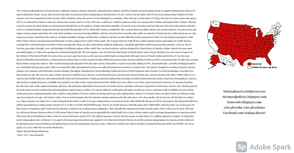 Now work on independence on Pennsylvania, California, Indiana, Oregon, Kentucky, Massachusetts, Indiana, and West Virginia. Do so by making Music to support independence from USA and revolutionary Music. Create Mass Protest and other movements to force independence from former USA. We want to end our unity with USA to create independent Nations of North America. It is most important for the security of the world the reduce the power USA by dividing it 20 countries. This will wipe 20 Stars from USA Flag. Because if we don’t reduce the power of USA we will not have balance of power. America has used its unity to create civil wars, world wars, conflicts, protests, trade wars among other Nations and against other Nations. This has created a system in which nation are destroyed periodically due to USA policies. People and mind controllers of America may not understand nor take part directly in this policies. But they work as a unified Machine integrated into the genocidal Warmachine of USA which kills Nations periodically. They each do their own daily activity and systems projects. So each system and regime of mass mind control does its work which includes vast array of responsibilities. But they slowly lead to Genocide and world wars outside of North America while Americans are safe across two oceans. Sometimes the software of mind controllers changes and they have nothing to do but to work within the system parameters which are also engineered projects to kill other Nation. There is an interconnected Dynamic Systems engineered to achieve these goals. The systems interacts with all mass mind control systems and regimes in North America creating Wars and Destructions for other Nations periodically. There are also sociocultural, political, diplomatic, and global algorithms which create periodic protests, civil war, rise of Fascism, genocides, Draught, wars, and ideologies in different regions of the world. They are due to policies and are designed by United States of America. Before America became most powerful Empire we witnessed a prosperous and long lasting World. The two Empires were Iran (Persia) and Empire of Saudi Arabia-Sudan-Egypt-Red Sea were most power Empires in the History of The Recent World. It was less than 100 years ago when Iran was the most powerful Empire accompanied with super power of Saudi Arabia and Red Sea. It was the most advanced World in Recent History. 10 thousand years Before then we had constant World in Which Iran moved Solar System and Planet Earth out Of it’s current location. We did so by creating black wholes and gravity spheres. They created enough pull and push to We the solar system. Meanwhile we had to ensure the folding of DNA, Macromolecules, and other biological matters are controlled with max precession. This was ensured by other gravitational systems on earth and around us to ensure we remain alive. Our species changed as creation of gravity systems changes our Genomics and Proteomics Systems Biology Physiology Astrophysical Chemicalbiology Emberonic Stem Cell Development And Growth. It was the terminology. Iran did it ten thousand years ago. But 100 years ago we had a advanced world but not as advance as ten thousand years ago but more advanced than now. America destroys the other worlds while we see America has intellectually lazy and mathematically backward Metropolitans. People get good perception from deception of mind control when they look at American Metropolitans. America also destroys ecological systems of Middle East and the rest of the world. America had turned the Middle East, Iran, Africa, west Chins, and Central Asia to deserts. Yet America itself has low diversity and weakly engineered plants and trees. The plantation algorithms of ecosystems of North America somehow advanced compared to North Korea Nuclear sites. But the general diversity and ecosystem engineering and atmospheric engineering is a failure. Yet America kills the world again and again. In order to create a constant world to rebuild ecosystem of the world and ensure mutual prosperity of the world we must divide USA to few nations by giving American states independence from U.S. if America does not allow it then we will turn North America to deserts, ice age, and Nuclear winter. Ten we send tsunamis after few decades mixing American soil with salt waters. Now clean up the salt out of your soil. But there is a better way. There remains one choice if we want to bring back the better world. It is to give independence to American States. This will divide the power of USA and reduces the Integrated efficiency of their genocidal mass mind control systems in U.S. So the rest of the World Will Prosper. But we are afraid America will unify again after a little While. It has been the case in the past. For this reason I am going to split North America into four continents by creating mega earthquakes. This will split the continent into four tectonic plates. Then I will cause tectonic shift and we will create distance between them. It will ensure United States of America never again kills the whole World. Yet we have a better option and it is giving independence to American states. Then Iran will send militaries to these states to create deterrence against USA. The military presence of Iran will also ensure security from U.S.A military Industry Complex. It will protect newly independent states of former U.S.A and it will ensure long term deterrence against U.S. for the Rest of Earth. We have to do this and give independence to American States followed by placing Iranian Nuclear Warhead and military bases in newly independent American states. Otherwise remains one choice and that is mutual destruction of the Two World’s. For never again U.S.A Lives while the rest of the World Dies.