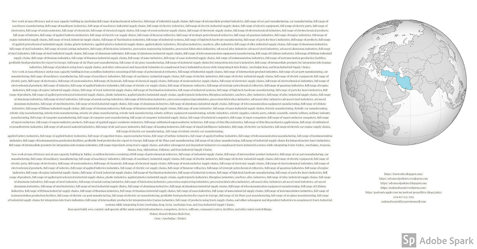 Now work at max efficiency and at max capacity building in Azerbaijan full range of petrochemical refineries, full range of industrial supply chains, full range of intermediate product industries, full range of car part manufacturing, car manufacturing, full range of machinery manufacturing, full range of machinery industries, full range of machinery industrial supply chains, full range of electric industries, full range of electric industrial supply chains, full range of electric equipment, full range of electric parts, full range of electronics, full range of semiconductors, full range of chemicals, full range of chemical supply chains, full range of semiconductor supply chains, full range of electronic supply chains, full range of electrochemical industries, full range of electrochemical products, full range of batteries, full range of applied batteries industries, full range of electric car supply chains, full range of Benzene refineries, full range of strategic petrochemical refineries, full range of quantum industries, full range of engine industries, full range of engine industrial supply chains, full range of truck industrial supply chains, full range of Machination Industries, full range of industrial systems, full range of high tech hardware manufacturing, full range of parts for Iran’s Industries, full range of products, full range of applied petrochemical industrial supply chains, plastic industries, applied plastics industrial supply chains, applied plastic industries, fiberglass industries, smelters, alloy industries, full range of alloy industrial supply chains, full range of aluminum industries, full range of steel industries, full range of metal casting industries, full range of fabrication industries, precession engineering industries, precession fabrication industries, advanced alloy industries advanced steel industries, advanced aluminum industries, full range of steel industries, full range of steel industrial supply chains, full range of aluminum industries, full range of aluminum industrial supply chains, full range of telecommunication equipment manufacturing, full range of Lithium industries, full range of lithium industrial supply chains ,full range of titanium industries, full range of titanium industrial supply chains, full range of nano industries, full range of nano industrial supply chains, full range of instrumentation industries, full range of instrumentation production facilities, profitable food production for export to Europe, full range of Air Plane part manufacturing, full range of air plane manufacturing, full range of industrial supply chains for integration into Iran’s industries, full range of intermediate products for integration into Iranian industries, full range of products using Iran’s supply chains, and other subsequent and dependent Industries to complement Iran’s Industrial systems while integrating it into Turkey, Azerbaijan Iran, and Iran Industrial Supply Chains. Now work at max efficiency and at max capacity building in Iran 10 million Industries consisting of full range of petrochemical refineries, full range of industrial supply chains, full range of intermediate product industries, full range of car part manufacturing, car manufacturing, full range of machinery manufacturing, full range of machinery industries, full range of machinery industrial supply chains, full range of electric industries, full range of electric industrial supply chains, full range of electric equipment, full range of electric parts, full range of electronics, full range of semiconductors, full range of chemicals, full range of chemical supply chains, full range of semiconductor supply chains, full range of electronic supply chains, full range of electrochemical industries, full range of electrochemical products, full range of batteries, full range of applied batteries industries, full range of electric car supply chains, full range of Benzene refineries, full range of strategic petrochemical refineries, full range of quantum industries, full range of engine industries, full range of engine industrial supply chains, full range of truck industrial supply chains, full range of Machination Industries, full range of industrial systems, full range of high tech hardware manufacturing, full range of parts for Iran’s Industries, full range of products, full range of applied petrochemical industrial supply chains, plastic industries, applied plastics industrial supply chains, applied plastic industries, fiberglass industries, smelters, alloy industries, full range of alloy industrial supply chains, full range of aluminum industries, full range of steel industries, full range of metal casting industries, full range of fabrication industries, precession engineering industries, precession fabrication industries, advanced alloy industries advanced steel industries, advanced aluminum industries, full range of steel industries, full range of steel industrial supply chains, full range of aluminum industries, full range of aluminum industrial supply chains, full range of telecommunication equipment manufacturing, full range of Lithium industries, full range of lithium industrial supply chains ,full range of titanium industries, full range of titanium industrial supply chains, full range of nano industries, full range of nano industrial supply chains, Robotic manufacturing, Robotic car manufacturing, robotic ship manufacturing, robotic train manufacturing, robotic air plane manufacturing, robotic tank manufacturing, robotic military equipment manufacturing, robotic industries, robotic supplies, robotic parts, robotic assembly, robotic military, military industry manufacturing, full range of computer manufacturing, full range of computer part manufacturing, full range of computer industrial supply chains, full range of industrial computers, full range of super computers, full range of superconductor computers, full range of superconductors, full range of superconductor