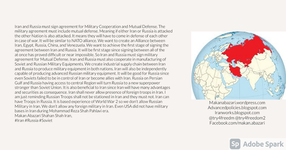 Iran and Russia must sign agreement for Military Cooperation and Mutual Defense. The military agreement must include mutual defense. Meaning if either Iran or Russia is attacked the other Nation is also attacked. It means they will have to come in defense of each other in case of war. It will be similar to NATO alliance. We want to create an Alliance between Iran, Egypt, Russia, China, and Venezuela. We want to achieve the first stage of signing the agreement between Iran and Russia. It will be first stage since signing between all of the at once has proved difficult or near impossible. So Iran and Russia must sign military agreement for Mutual Defense. Iran and Russia must also cooperate in manufacturing of Soviet and Russian Military Equipments. We create industrial supply chain between Iran and Russia to produce military equipment in both nations. Iran will also be independently capable of producing advanced Russian military equipment. It will be good for Russia since even Soviets failed to be in control of Iran or become allies with Iran. Russia on Persian Gulf and Russia having access to central Region will turn Russia to a new superpower stronger than Soviet Union. It is also beneficial to Iran since Iran will have many advantages and securities as consequence. Iran shall never allow presence of foreign troops in Iran. I am just reminding Russian Troops shall not be stationed in Iran and they must not. Iran can have Troops in Russia. It is based experience of World War 2 so we don’t allow Russian Military in Iran. We don’t allow any foreign military in Iran. Even USA did not have military bases in Iran during Mohammad Reza Shah Pahlavi era. Makan Abazari Shahan Shah Iran, Iran #Russia #Soviet