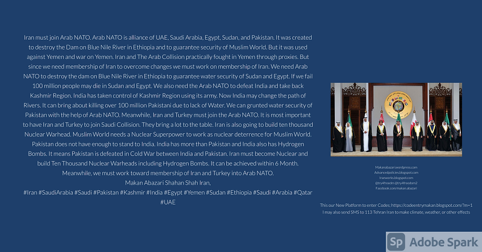 Iran must join Arab NATO. Arab NATO is alliance of UAE, Saudi Arabia, Egypt, Sudan, and Pakistan. It was created to destroy the Dam on Blue Nile River in Ethiopia and to guarantee security of Muslim World. But it was used against Yemen and war on Yemen. Iran and The Arab Collision practically fought in Yemen through proxies. But since we need membership of Iran to overcome changes we must work on membership of Iran. We need Arab NATO to destroy the dam on Blue Nile River in Ethiopia to guarantee water security of Sudan and Egypt. If we fail 100 million people may die in Sudan and Egypt. We also need the Arab NATO to defeat India and take back Kashmir Region. India has taken control of Kashmir Region using its army. Now India may change the path of Rivers. It can bring about killing over 100 million Pakistani due to lack of Water. We can grunted water security of Pakistan with the help of Arab NATO. Meanwhile, Iran and Turkey must join the Arab NATO. It is most important to have Iran and Turkey to join Saudi Collision. They bring a lot to the table. Iran is also going to build ten thousand Nuclear Warhead. Muslim World needs a Nuclear Superpower to work as nuclear deterrence for Muslim World. Pakistan does not have enough to stand to India. India has more than Pakistan and India also has Hydrogen Bombs. It means Pakistan is defeated in Cold War between India and Pakistan. Iran must become Nuclear and build Ten Thousand Nuclear Warheads including Hydrogen Bombs. It can be achieved within 6 Month. Meanwhile, we must work toward membership of Iran and Turkey into Arab NATO. Makan Abazari Shahan Shah Iran, #Iran #SaudiArabia #Saudi #Pakistan #Kashmir #India #Egypt #Yemen #Sudan #Ethiopia #Saudi #Arabia #Qatar #UAE