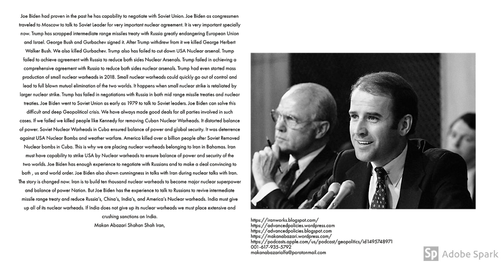 Joe Biden had proven in the past he has capability to negotiate with Soviet Union. Joe Biden as congressmen traveled to Moscow to talk to Soviet Leader for very important nuclear agreement. It is very important specially now. Trump has scrapped intermediate range missiles treaty with Russia greatly endangering European Union and Israel. George Bush and Gurbachev signed it. After Trump withdrew from it we killed George Herbert Walker Bush. We also killed Gurbachev. Trump also has failed to cut down USA Nuclear arsenal. Trump failed to achieve agreement with Russia to reduce both sides Nuclear Arsenals. Trump failed in achieving a comprehensive agreement with Russia to reduce both sides nuclear arsenals. Trump had even started mass production of small nuclear warheads in 2018. Small nuclear warheads could quickly go out of control and lead to full blown mutual elimination of the two worlds. It happens when small nuclear strike is retaliated by larger nuclear strike. Trump has failed in negotiations with Russia in both mid range missile treaties and nuclear treaties. Joe Biden went to Soviet Union as early as 1979 to talk to Soviet leaders. Joe Biden can solve this difficult and deep Geopolitical crisis. We have always made good deals for all parties involved in such cases. If we failed we killed people like Kennedy for removing Cuban Nuclear Warheads. It distorted balance of power. Soviet Nuclear Warheads in Cuba ensured balance of power and global security. It was deterrence against USA Nuclear Bombs and weather warfare. America killed over a billion people after Soviet Removed Nuclear bombs in Cuba. This is why we are placing nuclear warheads belonging to Iran in Bahamas. Iran must have capability to strike USA by Nuclear warheads to ensure balance of power and security of the two worlds. Joe Biden has enough experience to negotiate with Russians and to make a deal convincing to both , us and world order. Joe Biden also shown cunningness in talks with Iran during nuclear talks with Iran. The story is changed now. Iran is to build ten thousand nuclear warheads to become major nuclear superpower and balance of power Nation. But Joe Biden has the experience to talk to Russians to revive intermediate missile range treaty and reduce Russia’s, China’s, India’s, and America’s Nuclear warheads. India must give up all of its nuclear warheads. If India does not give up its nuclear warheads we must place extensive and crushing sanctions on India. Makan Abazari Shahan Shah Iran, #Joe #Biden #USA #Joe #Biden #USSR #Russia #Kennedy #Trump #Cuba #Nuclear #Balance of #Power #World #Order