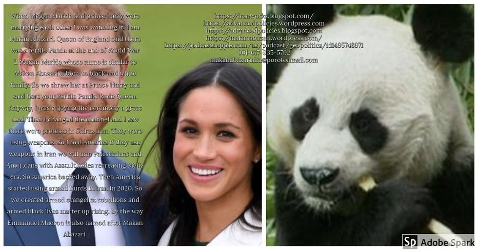 When Megan Markle and prince harry were marrying each other I was watching it. I am Makan Abazari. Queen of England said there was a fertile Panda at the end of World War 1. Megan Markle whose name is similar to Makan Abazari is born to black and white family. So we threw her at Prince Harry and said here your Fertile Panda. Rude Queen. Anyway, I was enjoying the ceremony a great deal. Then I changed the channel and I saw there were protests in Shiraz Iran. They were using weapons. So I told America if they use weapons in Iran we will arm Palestinians and Americans with Assault Rifles recreating Mafia era. So America backed away. Then America started using armed Kurds in Iran in 2020. So we created armed evangelist rebellions and armed black lives matter up rising. By the way Emmanuel Macron is also named after Makan Abazari.So Saxon is Susa, Shush, Saud, Suadn, Somalia, and Suez canal. My brother is Saman Abazari. England is also Egypt and Ethiopia. So England is a fake empire. The king of Saudi Arabia is Salman. I am Makan Abazari. Fars Shiraz, is Persia or France. We speak Parsi and their capital is Paris. Arabs cannot say Paris so they have Baris. SO we have Boris Johnson. Fars Jahan Son. I makan Abazari built a bridge and continent over pacific ocean. So I am Makan Abazari the Papa John or Father of the World. So we have Emmanuel Macron of France and Makan Abazari of Fars or Persia. We also have Megan Markle the dutches of Sussex or the same as Saud. But we kicked her out of Royal Family. So she is just fertile Panda. Makan Abazari Shahn Shah Iran, Fars, Persia, and France.Saman Abazari Shahan Shah Saudi Arabia, Sudan, Saxon, England, UK,Egypt, Ethiopia, Somalia, Britain, and the Red Sea London Bridge is broken. The London bridge is connected to Bridge Tabiat in Iran. Meaning Makan Abazari is now the King of The Great Britain.When Megan Markle and prince harry were marrying each other I was watching it. I am Makan Abazari. Queen of England said there was a fertile Panda at the end of World War 1. Megan Markle whose name is similar to Makan Abazari is born to black and white family. So we threw her at Prince Harry and said here your Fertile Panda. Rude Queen. Anyway, I was enjoying the ceremony a great deal. Then I changed the channel and I saw there were protests in Shiraz Iran. They were using weapons. So I told America if they use weapons in Iran we will arm Palestinians and Americans with Assault Rifles recreating Mafia era. So America backed away. Then America started using armed Kurds in Iran in 2020. So we created armed evangelist rebellions and armed black lives matter up rising. By the way Emmanuel Macron is also named after Makan Abazari. Britain must continue Trade Agreement negotiations with European Union. European Union must give favorable offers for trade agreement to UK negotiators. Meaning they must give bonuses to Britain. European Union must comply with requests of United Kingdom in this trade agreements.United Kingdom must establish direct rule and control over Australia, Canada, and other British Colonies. United Kingdom must purchase bankrupt and strategic Private Corporations for British Crown. Then we revive Crownwealth economic system in Britain. Meaning Crownwealth will use corporations under its ownership to expand the size of economy and building more strategic sectors. These new strategic sectors shall be under ownership of Crown. These economic activities shall be profitable for the Crown accumulating more wealth. The Crownwealth shall be used for colonizing Earth and Solar System. Crownwealth shall pay into public protection and Social programs once Crownwealth system is successful and has enough profitable economic projects under its control.Iran and Britain shall build military bases on border of USA and Canada. Iran shall have military presence in Canada to have deterrence against USA.British Parliament shall support trade agreement with Iran. British Parliament shall support sell of weapons to Iran. Trade agreement with Iran shall not be put for vote on House of Common. We have mechanisms in Britain to avoid voting by Parliament by having Prime Minister Boris Johnson and crown agreeing on making new laws, making decisions, and signing trade agreement. It means trade agreement with Iran will bypass House of Commons and shall not put fo vote. But we need members of British Parliament who support trade agreement with Iran who shall do their best to achieve trade agreement with Iran. They must talk during open and closed sessions of House of Commons to motivate the British government to start trade talks with Iran.Mr Prime Minister Boris Johnson shall dispatch a negotiation team to Iran as early as next week to start trade talks. Mr Boris Johnson has the trade agreement with Iran to be his first priority. Prime Minister shall do his best to improve relations with Iran to level of strategic alliance. Iran is geopolitical superpower and diplomatic powerhouse capable of brining major benefit to Britain. The crown has lived in Iran in the past and has great favor with Iran.Prime Minister must remember when Gibraltar government took Iranian oil tanker I had to personally negotiate with Iran and with British government to release the oil tanker and I released the oil tanker. The ceasing of oil tanker was a plot by USA who had mind controlled Gibraltar officials to cease Iranian Oil Tanker. Yet it had negatively impacted Iran and Britain relations. Iran and Britain shall back track and improve their ties to level strategic alliance. I am also sending prime minister Boris Johnson to Iran for an official visit to create a complete trade agreements. It is most important to sign a trade agreement with Iran for the sake of the interests of Empire of The Great Britain.Britain and USA must delay Trade talk until Trump leaves office. Because Trump will bully britain in making a bad Trade Deal for Britain. The negotiations on trade deal between Britain and USA will sta