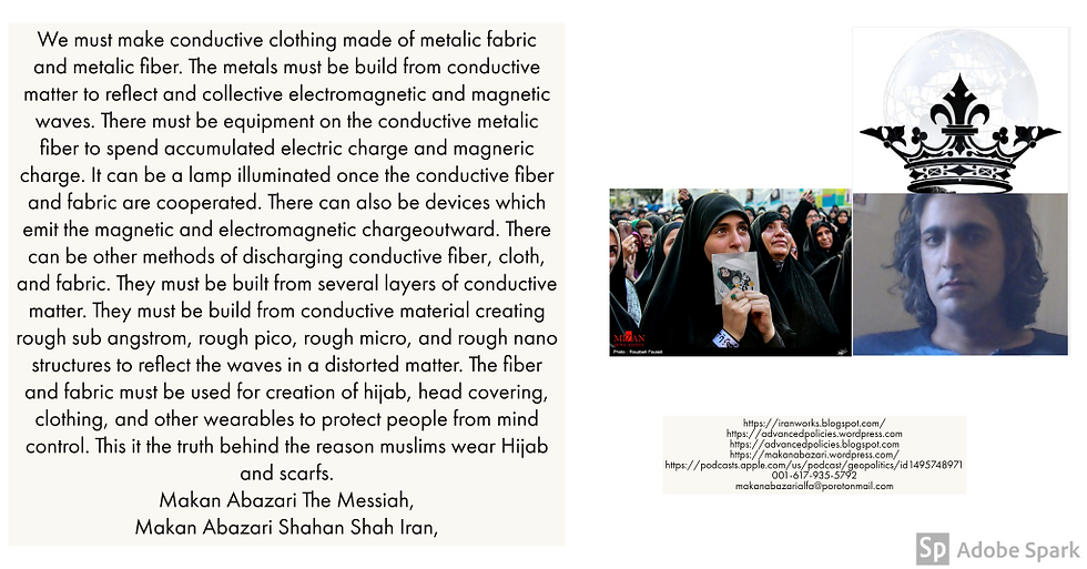 We must make conductive clothing made of metalic fabric and metalic fiber. The metals must be build from conductive matter to reflect and collective electromagnetic and magnetic waves. There must be equipment on the conductive metallic fiber to spend accumulated electric charge and magnetic charge. It can be a lamp illuminated once the conductive fiber and fabric are cooperated. There can also be devices which emit the magnetic and electromagnetic charge outward. There can be other methods of discharging conductive fiber, cloth, and fabric. They must be built from several layers of conductive matter. They must be build from conductive material creating rough sub angstrom, rough pico, rough micro, and rough nano structures to reflect the waves in a distorted matter. The fiber and fabric must be used for creation of hijab, head covering, clothing, and other wearables to protect people from mind control. This it the truth behind the reason muslims wear Hijab and scarfs.