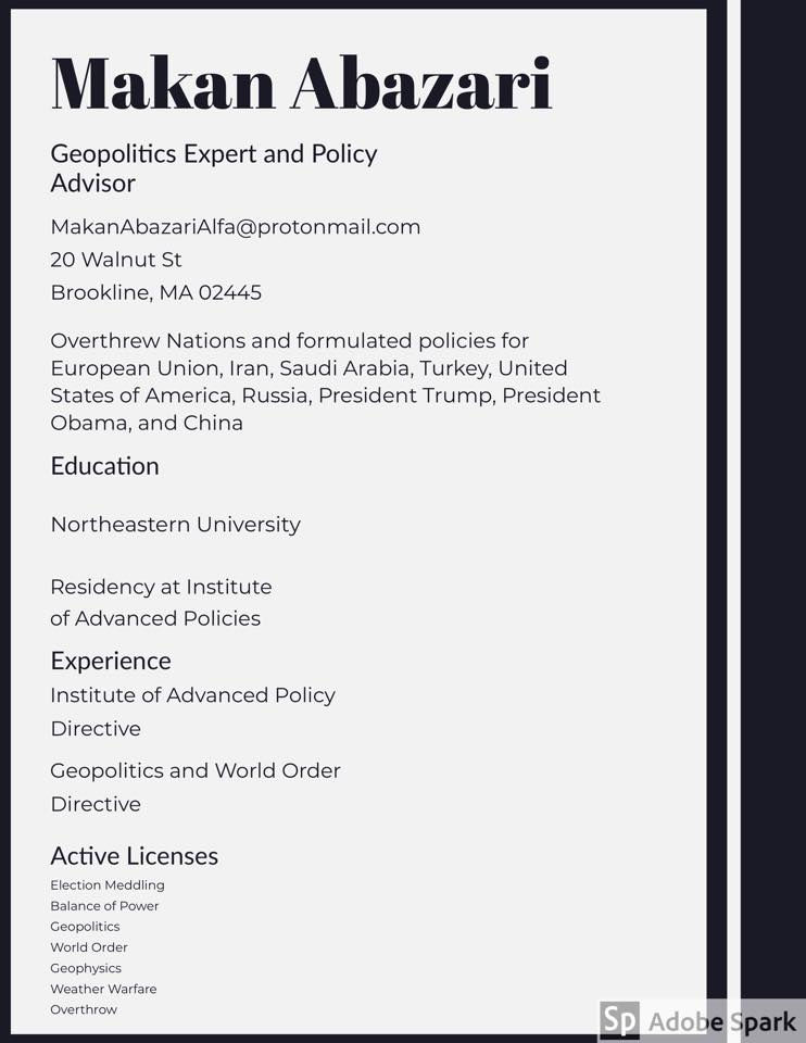President of Iran and Prime Minister of Great Britain must schedule a meeting. Boris Johnson went to Iran to do my projects when he was foreign minister. Back then we hoped he will become Prime Minister and soon will travel to Iran. It has been years since British Prime Minister have not traveled to Iran. It is right about the time Boris Johnson travels to Iran. I was in Iran during 2019. I closed British House of Commons. They think the Queen closed it by the help of her advisors. But I closed British Parliament. I helped Theresa May a great deal during critical moments of BREXIT. Then when Boris Johnson was about to become prime minister Gibraltar Authorities took Iran Grace One Ship Hostage. I worked very hard to free the Grace one Ship. I had a girl friend whose name was niloofar. I wanted the ship the be called niloofar. But they called Adrian Darya. The Gibraltar Authority took Iranian ship hostage due to plots of USA Military Mind Control. They wanted the start of Prime Ministership of Iran and Britain to be the problem with the ship. That created diplomatic problems. The engineered diplomatic issue created difficulties in our path to improve Iran and Britain relations. We call him Boris it is similar to Baris. Baris is how Arabs pronounce Paris. But We are Fars or Persian and we speak Parsi or Farsi. So It not Boris but it is Fars. Johnson also means Jahan Son. Meaning children of the world. Boris Johnson or Fars children of the world. I am Makan Abazari the Papa John or Father of World. Because I created continent over Pacific Ocean by activating volcanos. It became islands and it became under water continent. In centuries and thousands of years when the gravity changes the orientation of earth we will see my continent will come out of planet earth. So Boris Johnson is Fars Children of the world. I am Makan Abazari The father world and I am also Fars. Anyway, Boris Johnson must travel to Iran and sign trade agreement with Iran. Iran and Britain must formulate trade agreement. Iran and Britain must improve relations. I expect it to happen as soon as possible. Makan Abazari Shahan Shah Iran, #Iran #Britain Mind control:”Makan Abazari is father of the world or better said supreme boss of all mind controllers. But he cannot get girl friends and is tortures in 20 walnut street apt 4 Brookline Ma 02445” Makan:”I am Supreme Boss of all of the world mind controllers?” Mind control:”Yes.” Makan:”I thought I am prince of Parto or Prince of waves and rays.” Mind control:”When you started the Journey but in 2018 you became supreme boss of all of the world mind controllers.” (Another mind control does not let us explain the details) Makan:”Remember. Not even one of you helped me to get girl friends, wealth, security, or even simplest assistance.” Mind control:”Talk about Makan Abazari the Prince of Partoha and Makan Abazari the Papa John. I caused earthquakes in Puerto Prince Haiti and mind control years later said:” Makan Abazari The Prince of Partoha ماکان اباذری شاهزاده پرتوها . Haiti also means Makan Abazari the one hated by mind controllers. Then mind control said go conquer the whole world. So I overthrew this earth. I owned this earth from birth then I conquered it bloodless conquest then in defense and then in offense. Meaning I own the earth four times. So I overthrew every nation. In 2012 I tilted planet earth by 0.66 degree by an earthquake in Chile. Then I activated volcanos in pacific since 2018 until today and I have built the bridge over pacific ocean. I have also created a continent over pacific ocean. So I am Makan Abazari The Papa John. Papa is father and John is جهان or the father of the world. But mind control says I am the Supreme Boss of all of the world mind controllers. But I don’t have mind control equipment. “ Mind control:”I forgot Massachusetts mind control hate systems made us not able to communicate. Hold on.” Mind control:”What happened to battle of Mahdi and Antichrist? Or better said Messiah and Dajjal?” Makan:”I must first build a conductive wall to protect people from mind control. The wall must be made of Copper مس and mess is Massih Messiah!” Mind control:”No. talk about the part you fight antichrist.” Makan:”I built the continent and I became Papa John or the father of world. Then mind control called me dog. But other mind control said it accept him as The King of Kings or if you mess around he will become Alfa and Omega. But the first mind control called me dog again. Then the software started saying Makan Abazari The God. Makan Abazari The Alfa and Omega. Makan Abazari Khoda خدا. Meaning Makan Abazari is God. But I said لاالاهالله I cannot type it correctly so I type it in farsi تنها یک خدا وجود دارد خدای یکتا Then mind control of Muslims said he is my slave now. Then I said Makan Abazari Shahan Shah Iran ماکان اباذری شاهان شاه ایران This is how I defeated antichrist. So I am supreme Boss of All of mind controllers? Yes. Thanks. But I don’t have mind control equipment. But I indirectly mind control half of population of the earth. Thanks for all teams and staff. Teams and Staff certain global mind control:”We must make it impossible to ever rise.” Makan:”I heard you. I can kill the earth. I can cause polar shift. You are lucky I am very ethical. Now kill the mind control base making it impossible to work here and mind control making it impossible to type. Also kill the mind control bases making it difficult for me to become Supreme Boss of all mind controllers.” Mind control:”Half an hour ago he only wanted a girl friend, wealth, systems, organizations, Intelligence agency, career, and some friend. He also wanted to directly control them at interpersonal level.” Mind control:”Half of the world was fighting to prevent you from dating that girl. It was world war of mind control.” Makan:”I don’