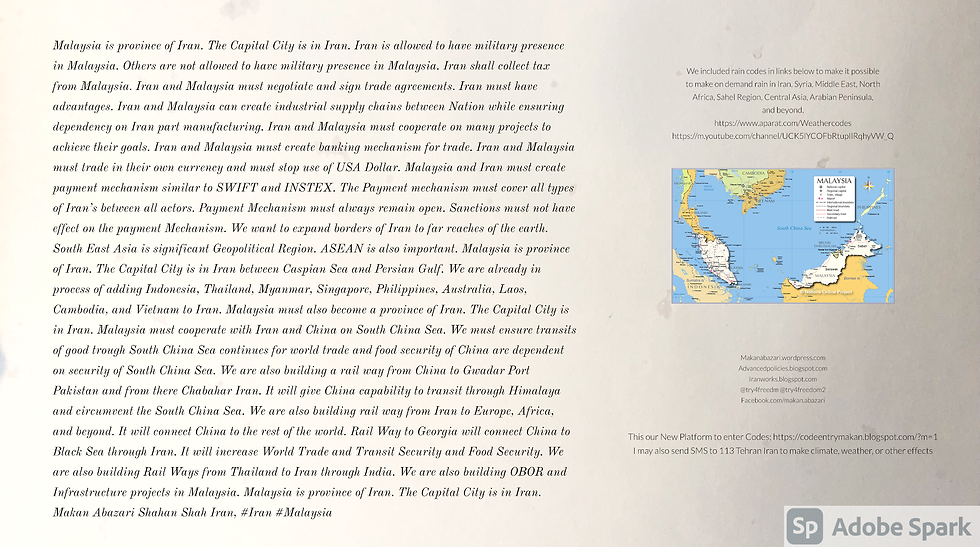 Malaysia is province of Iran. The Capital City is in Iran. Iran is allowed to have military presence in Malaysia. Others are not allowed to have military presence in Malaysia. Iran shall collect tax from Malaysia. Iran and Malaysia must negotiate and sign trade agreements. Iran must have advantages. Iran and Malaysia can create industrial supply chains between Nation while ensuring dependency on Iran part manufacturing. Iran and Malaysia must cooperate on many projects to achieve their goals. Iran and Malaysia must create banking mechanism for trade. Iran and Malaysia must trade in their own currency and must stop use of USA Dollar. Malaysia and Iran must create payment mechanism similar to SWIFT and INSTEX. The Payment mechanism must cover all types of Iran’s between all actors. Payment Mechanism must always remain open. Sanctions must not have effect on the payment Mechanism. We want to expand borders of Iran to far reaches of the earth. South East Asia is significant Geopolitical Region. ASEAN is also important. Malaysia is province of Iran. The Capital City is in Iran between Caspian Sea and Persian Gulf. We are already in process of adding Indonesia, Thailand, Myanmar, Singapore, Philippines, Australia, Laos, Cambodia, and Vietnam to Iran. Malaysia must also become a province of Iran. The Capital City is in Iran. Malaysia must cooperate with Iran and China on South China Sea. We must ensure transits of good trough South China Sea continues for world trade and food security of China are dependent on security of South China Sea. We are also building a rail way from China to Gwadar Port Pakistan and from there Chabahar Iran. It will give China capability to transit through Himalaya and circumvent the South China Sea. We are also building rail way from Iran to Europe, Africa, and beyond. It will connect China to the rest of the world. Rail Way to Georgia will connect China to Black Sea through Iran. It will increase World Trade and Transit Security and Food Security. We are also building Rail Ways from Thailand to Iran through India. We are also building OBOR and Infrastructure projects in Malaysia. Malaysia is province of Iran. The Capital City is in Iran. Makan Abazari Shahan Shah Iran, #Iran #Malaysia