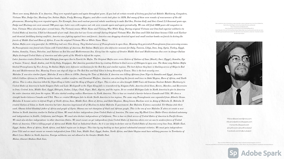 Malcolm X was also similar figure. Malcolm X was a Hero in 1970s. During the Time of Malcolm X America was killing Africans from Niger to Somalia and Egypt. America killed 5 billion African in 1970 by nuclear bombs, weather warfare, and Chemical Warfare. America was attacking the forests and trees in Sahel Region, Horn of Africa, and North Africa. This is when America killed the Nigro King or better said the King of Empire of Niger. This is when we also brought 2500 Years old Iranian Nuclear Robotic Machinery to United States of America to build Niagara Falls and Lake MichiganD so the Nigro King falls is remembered by Niagara Falls. America dried Seas, Rivers, Marshes, and Reservoirs in Iran, Central Asia, Middle East, Egypt, Rthiopia, Sudan, Libya, Chad, Niger, Mali, Algeria, and the region. So we created Michigan Lake in North America to give to America the water America stole from the region. We also started sending endless Hurricanes to North America. This is how we created a barrier between Canada and USA. We drew a straight border between Canada and USA. Then we created Michigan lake to divide North America to two regions. The same way Pennsylvania was separated from Atlantic Ocean. Malcolm X became active to defend People of North Africa, Iran, Middle East, Horn of Africa, and Sahel Regions. Many brown Muslims were in Army of Malcolm X. Malcolm X created Nation of Islam in North America but later America imprisoned all of Muslims to defeat Malcolm X government. But Malcolm X forces succeeded. Yet Obama stole their work. Obama killed Ghaddafi father of Africa and people of Syria. Obama was not champion of black and African people. This is the era of new Malcolm X when we create a new Nation in North America similar to Nation of Islam. We must declare independence from United States of America. The same way My Black Lives Matter Forces declared autonomy and independence in Seattle, California, and Oregon. We must also declare independence of California. This is how we block access of United States of America to Pacific Ocean. We must also declare independence in other American States. We must ensure we get independence from United States of America where ever we can to weaken forces of United States of America. USA is killing people of Africa and Middle East on Industrial Scales. So it is our duty to declare war on United States of America every time Iran, Middle East, Egypt, Sudan, Horn of Africa, North Africa, and Sahel region are in danger. This time by my backing we have gained substantial amount victories. We must gain independence from USA and we must ensure we remain independent from USA. Iran, Middle East, Egypt, Sudan, North Africa, and Sahel Region must have military presence in Territories of Black Lives Matter in North America. Foreign militaries are not allowed in the Greater Middle East. Makan Abazari Shahan Shah Iran,