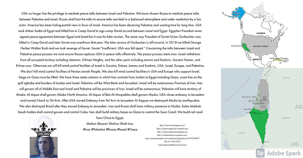 USA no longer has the privilege to mediate peace talks between Israel and Palestine. We have chosen Russia to mediate peace talks between Palestine and Israel. Russia shall host the talks to ensure talks are held in a balanced atmosphere and under mediation by a fair actor. America has been holing partial view in favor of Israel. America has been deceiving Palestine and wasting time for long time. USA took Anbar Sadat of Egypt and killed him in Camp David to sign camp David accord between Israel and Egypt. Egyptian President never signed peace agreement between Egypt and Israel but it was his fake version. The same way President of Soviet Union Gorbachev was killed in Camp David and later Soviet was overthrow that year. The fake version of Gorbachev is still around. In 2018 we killed George Herber Walker Bush and we took revenge of Soviet. Soviet:”Insufficient. USA was fall apart.” Concerning the talks between Israel and Palestine peace process we must ensure Russia replaces USA in peace talks effectively. The peace process starts now. Israel withdraws from all occupied territory including Lebanon, Gilman Heights, and the other parts including Jammu and Kashmir, Socotra Yemen, and Eritrea now. Otherwise we will kill mind control facilities of Israel in Socotra, Eritrea, Jammu and Kashmir, USA, Israel, Europe, and Palestine. We don’t kill mind control facilities of Persian Jewish People. We also kill mind control facilities in USA and Europe who support Israel. Siege on Gaza must be lifted. We have three states solution in which Iran controls from Jordan to Egypt including Gaza, coast line on the gulf aghabe and borders of Jordan and Israel. Palestine will be West Bank and Jerusalem. Israel will be autonomous Province of Iran. Iran will govern all of Middle East and Israel and Palestine will be provinces of Iran. Israel will be autonomous. Palestine will have territory of Alaska. Al-Aqssa shall govern Alaska North America. Al-Aqssa of Beit-Al-Moqaddas shall govern Alaska. USA closes embassy in Jerusalem and moved it back to Tel-Aviv. After USA moved Embassy from Tel-Aviv to Jerusalem Al-Aqqssa we destroyed Alaska by earthquakes. We also destroyed Brazil after they moved Embassy to Jerusalem. Iran and Russia shall have military presence in Alaska. Kabe Makkah Saudi Arabia shall control govern and control Cuba. Iran shall build military bases on Gaza to control the Suez Canal. We build rail road from China to Egypt. Makan Abazari Shahan Shah Iran, #Iran #Palestine #Russia #Israel #Gaza