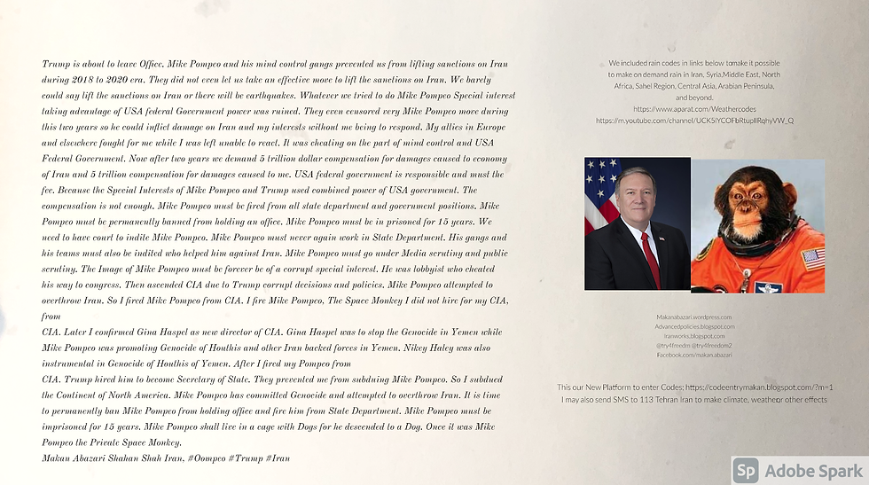 Trump is about to leave Office. Mike Pompeo and his mind control gangs prevented us from lifting sanctions on Iran during 2018 to 2020 era. They did not even let us take an effective move to lift the sanctions on Iran. We barely could say lift the sanctions on Iran or there will be earthquakes. Whatever we tried to do Mike Pompeo Special interest taking advantage of USA federal Government power was ruined. They even censored very Mike Pompeo move during this two years so he could inflict damage on Iran and my interests without me being to respond. My allies in Europe and elsewhere fought for me while I was left unable to react. It was cheating on the part of mind control and USA Federal Government. Now after two years we demand 5 trillion dollar compensation for damages caused to economy of Iran and 5 trillion compensation for damages caused to me. USA federal government is responsible and must the fee. Because the Special Interests of Mike Pompeo and Trump used combined power of USA government. The compensation is not enough. Mike Pompeo must be fired from all state department and government positions. Mike Pompeo must be permanently banned from holding an office. Mike Pompeo must be in prisoned for 15 years. We need to have court to indite Mike Pompeo. Mike Pompeo must never again work in State Department. His gangs and his teams must also be indited who helped him against Iran. Mike Pompeo must go under Media scrutiny and public scrutiny. The Image of Mike Pompeo must be forever be of a corrupt special interest. He was lobbyist who cheated his way to congress. Then ascended CIA due to Trump corrupt decisions and policies. Mike Pompeo attempted to overthrow Iran. So I fired Mike Pompeo from CIA. I fire Mike Pompeo, The Space Monkey I did not hire for my CIA, from CIA. Later I confirmed Gina Haspel as new director of CIA. Gina Haspel was to stop the Genocide in Yemen while Mike Pompeo was promoting Genocide of Houthis and other Iran backed forces in Yemen. Nikey Haley was also instrumental in Genocide of Houthis of Yemen. After I fired my Pompeo from CIA. Trump hired him to become Secretary of State. They prevented me from subduing Mike Pompeo. So I subdued the Continent of North America. Mike Pompeo has committed Genocide and attempted to overthrow Iran. It is time to permanently ban Mike Pompeo from holding office and fire him from State Department. Mike Pompeo must be imprisoned for 15 years. Mike Pompeo shall live in a cage with Dogs for he descended to a Dog. Once it was Mike Pompeo the Private Space Monkey. Makan Abazari Shahan Shah Iran, #Oompeo #Trump #Iran