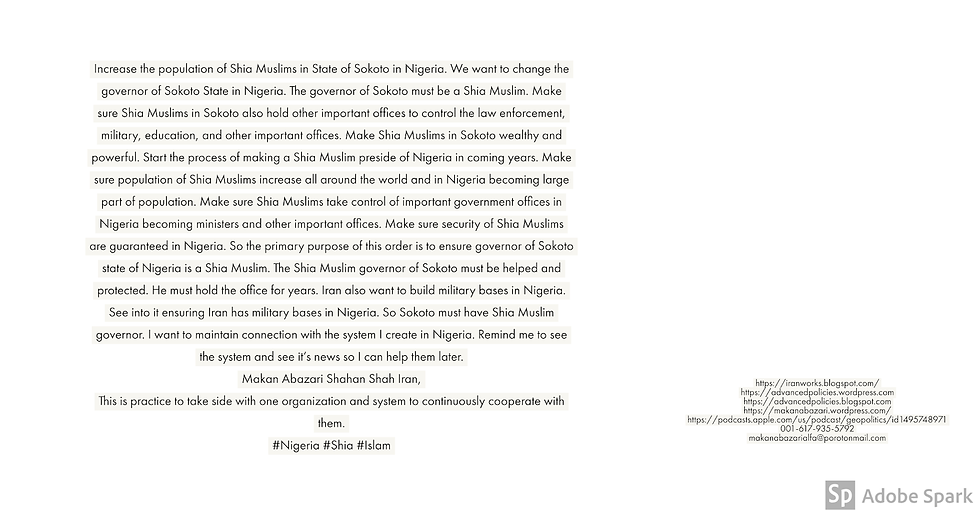 Increase the population of Shia Muslims in State of Sokoto in Nigeria. We want to change the governor of Sokoto State in Nigeria. The governor of Sokoto must be a Shia Muslim. Make sure Shia Muslims in Sokoto also hold other important offices to control the law enforcement, military, education, and other important offices. Make Shia Muslims in Sokoto wealthy and powerful. Start the process of making a Shia Muslim preside of Nigeria in coming years. Make sure population of Shia Muslims increase all around the world and in Nigeria becoming large part of population. Make sure Shia Muslims take control of important government offices in Nigeria becoming ministers and other important offices. Make sure security of Shia Muslims are guaranteed in Nigeria. So the primary purpose of this order is to ensure governor of Sokoto state of Nigeria is a Shia Muslim. The Shia Muslim governor of Sokoto must be helped and protected. He must hold the office for years. Iran also want to build military bases in Nigeria. See into it ensuring Iran has military bases in Nigeria. So Sokoto must have Shia Muslim governor. I want to maintain connection with the system I create in Nigeria. Remind me to see the system and see it’s news so I can help them later. Makan Abazari Shahan Shah Iran, This is practice to take side with one organization and system to continuously cooperate with them.