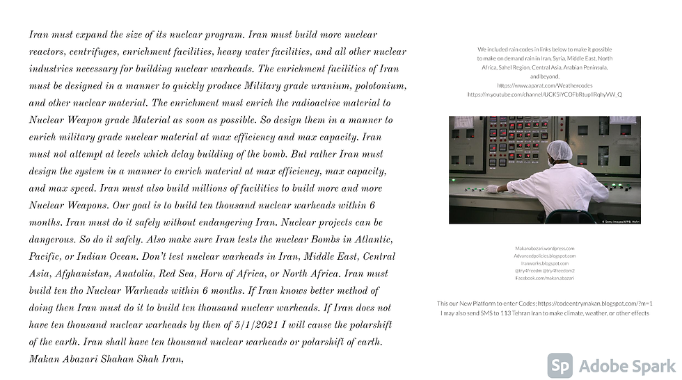 Iran must expand the size of its nuclear program. Iran must build more nuclear reactors, centrifuges, enrichment facilities, heavy water facilities, and all other nuclear industries necessary for building nuclear warheads. The enrichment facilities of Iran must be designed in a manner to quickly produce Military grade uranium, polotonium, and other nuclear material. The enrichment must enrich the radioactive material to Nuclear Weapon grade Material as soon as possible. So design them in a manner to enrich military grade nuclear material at max efficiency and max capacity. Iran must not attempt at levels which delay building of the bomb. But rather Iran must design the system in a manner to enrich material at max efficiency, max capacity, and max speed. Iran must also build millions of facilities to build more and more Nuclear Weapons. Our goal is to build ten thousand nuclear warheads within 6 months. Iran must do it safely without endangering Iran. Nuclear projects can be dangerous. So do it safely. Also make sure Iran tests the nuclear Bombs in Atlantic, Pacific, or Indian Ocean. Don’t test nuclear warheads in Iran, Middle East, Central Asia, Afghanistan, Anatolia, Red Sea, Horn of Africa, or North Africa. Iran must build ten tho Nuclear Warheads within 6 months. If Iran knows better method of doing then Iran must do it to build ten thousand nuclear warheads. If Iran does not have ten thousand nuclear warheads by then of 5/1/2021 I will cause the polarshift of the earth. Iran shall have ten thousand nuclear warheads or polarshift of earth.