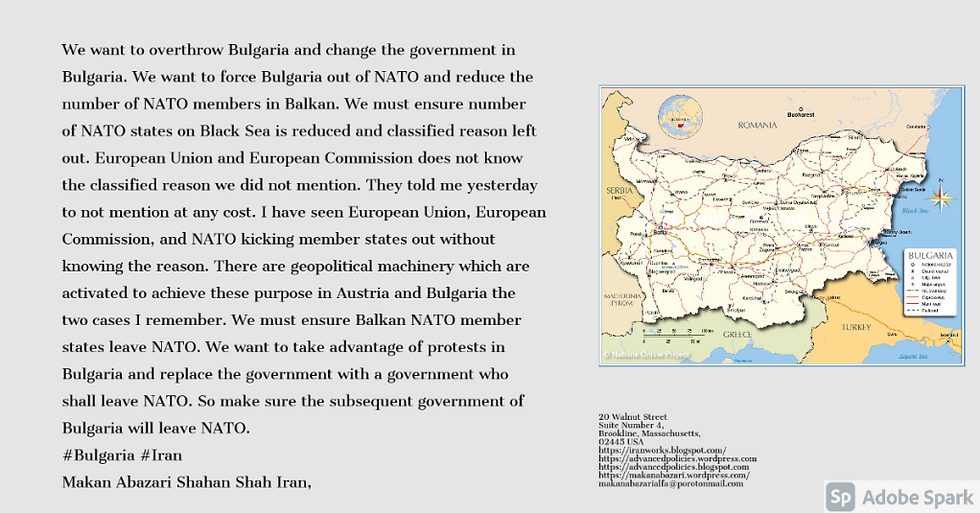 We want to overthrow Bulgaria and change the government in Bulgaria. We want to force Bulgaria out of NATO and reduce the number of NATO members in Balkan. We must ensure number of NATO states on Black Sea is reduced and classified reason left out. European Union and European Commission does not know the classified reason we did not mention. They told me yesterday to not mention at any cost. But I have seen European Union, European Commission, and NATO kicking member states out without knowing the reason. There are geopolitical machinery which are activated to achieve these purpose in Austria and Bulgaria the two cases I remember. We must ensure Balkan NATO member states leave NATO. We want to take advantage of protests in Bulgaria and replace the government with a government who shall leave NATO. So make sure the subsequent government of Bulgaria will leave NATO. #Bulgaria #IranMakan Abazari Shahan Shah Iran,