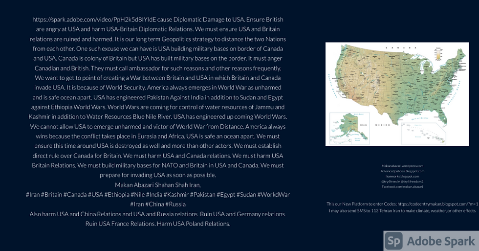 https://spark.adobe.com/video/PpH2k5d8IYIdE cause Diplomatic Damage to USA. Ensure British are angry at USA and harm USA-Britain Diplomatic Relations. We must ensure USA and Britain relations are ruined and harmed. It is our long term Geopolitics strategy to distance the two Nations from each other. One such excuse we can have is USA building military bases on border of Canada and USA. Canada is colony of Britain but USA has built military bases on the border. It must anger Canadian and British. They must call ambassador for such reasons and other reasons frequently. We want to get to point of creating a War between Britain and USA in which Britain and Canada invade USA. It is because of World Security. America always emerges in World War as unharmed and is safe ocean apart. USA has engineered Pakistan Against India in addition to Sudan and Egypt against Ethiopia World Wars. World Wars are coming for control of water resources of Jammu and Kashmir in addition to Water Resources Blue Nile River. USA has engineered up coming World Wars. We cannot allow USA to emerge unharmed and victor of World War from Distance. America always wins because the conflict takes place in Eurasia and Africa. USA is safe an ocean apart. We must ensure this time around USA is destroyed as well and more than other actors. We must establish direct rule over Canada for Britain. We must harm USA and Canada relations. We must harm USA Britain Relations. We must build military bases for NATO and Britain in USA and Canada. We must prepare for invading USA as soon as possible. Makan Abazari Shahan Shah Iran, #Iran #Britain #Canada #USA #Ethiopia #Nile #India #Kashmir #Pakistan #Egypt #Sudan #WorkdWar #Iran #China #Russia Also harm USA and China Relations and USA and Russia relations. Ruin USA and Germany relations. Ruin USA France Relations. Harm USA Poland Relations.