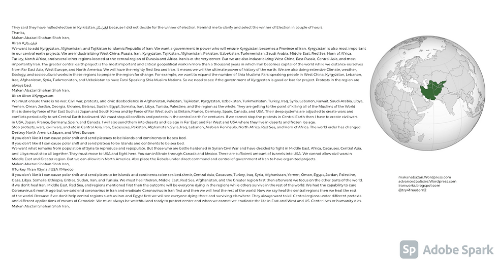 We want to add Kyrgyzstan, Afghanistan, and Tajikistan to Islamic Republic of Iran. We want a government in power who will ensure Kyrgyzstan becomes a Province of Iran. Kyrgyzstan is also most important in our central earth projects. We are industrializing West China, Russia, Iran, Kyrgyzstan, Tajikistan, Afghanistan, Pakistan, Uzbekistan, Turkmenistan, Saudi Arabia, Middle East, Red Sea, Horn of Africa. Turkey, North Africa, and several other regions located at the central region of Eurasia and Africa. Iran is at the very center. But we are also industrializing West China, East Russia, Central Asia, and most importantly Iran. The greater central earth project is the most important and critical geopolitical work in more than a thousand years in which Iran becomes capital of the world while we distance ourselves from Far East Asia, West Europe, and North America. We will have the mighty Red Sea and Iran. It means we will the ultimate power of history of the earth. We are also doing extensive Climate, weather, Ecology, and sociocultural works in these regions to prepare the region for change. For example, we want to expand the number of Shia Muslims Farsi speaking people in West China, Kyrgyzstan, Lebanon, Iraq, Afghanistan, Syria, Turkmenistan, and Uzbekistan to have Farsi Speaking Shia Muslim Nations. So we need to see if the government of Kyrgyzstan is good or bad for project. Protests in the region are always bad. Makan Abazari Shahan Shah Iran,