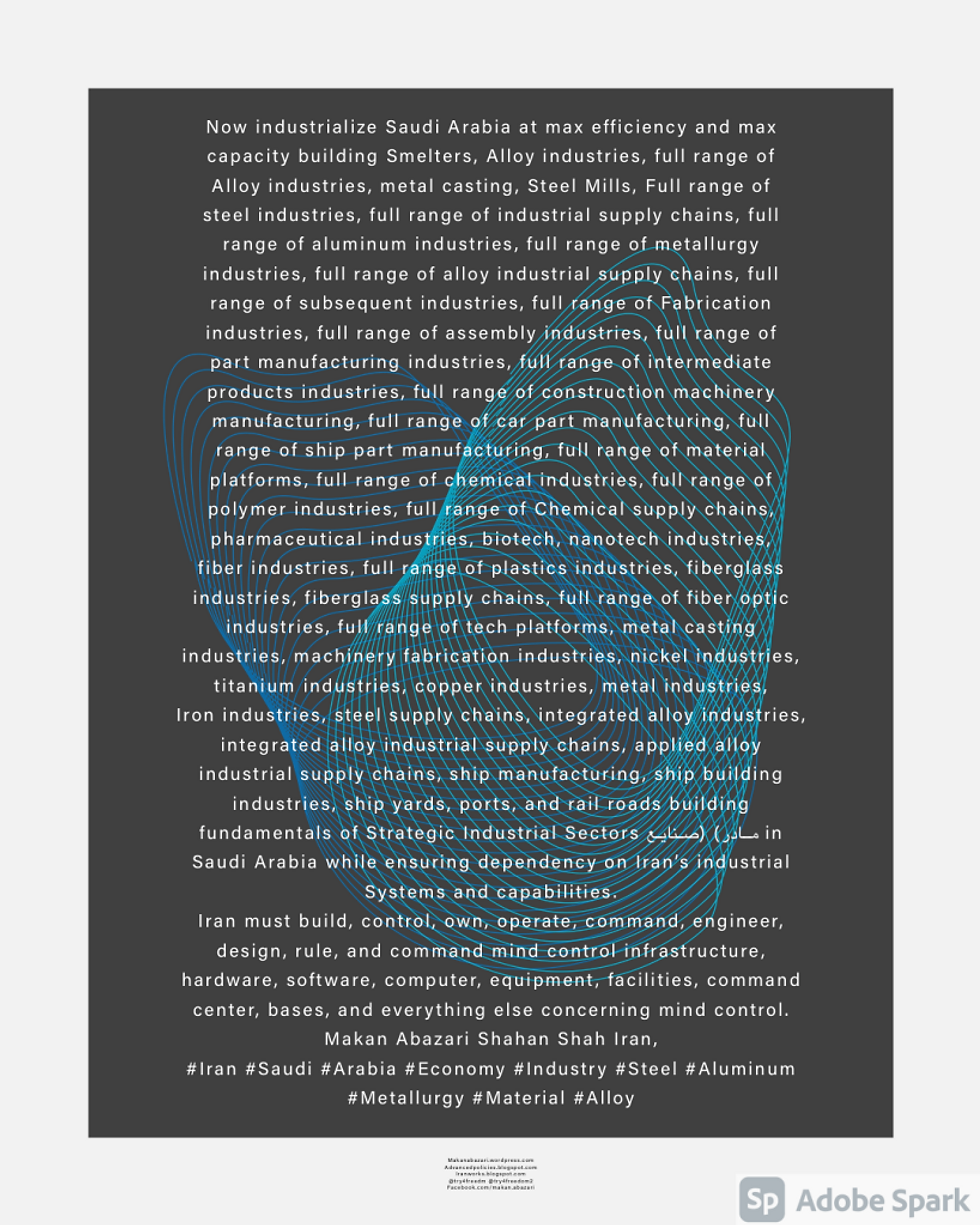 Now industrialize Saudi Arabia at max efficiency and max capacity building Smelters, Alloy industries, full range of Alloy industries, metal casting, Steel Mills, Full range of steel industries, full range of industrial supply chains, full range of aluminum industries, full range of metallurgy industries, full range of alloy industrial supply chains, full range of subsequent industries, full range of Fabrication industries, full range of assembly industries, full range of part manufacturing industries, full range of intermediate products industries, full range of construction machinery manufacturing, full range of car part manufacturing, full range of ship part manufacturing, full range of material platforms, full range of chemical industries, full range of polymer industries, full range of Chemical supply chains, pharmaceutical industries, biotech, nanotech industries, fiber industries, full range of plastics industries, fiberglass industries, fiberglass supply chains, full range of fiber optic industries, full range of tech platforms, metal casting industries, machinery fabrication industries, nickel industries, titanium industries, copper industries, metal industries, Iron industries, steel supply chains, integrated alloy industries, integrated alloy industrial supply chains, applied alloy industrial supply chains, ship manufacturing, ship building industries, ship yards, ports, and rail roads building fundamentals of Strategic Industrial Sectors (صنایع مادر) in Saudi Arabia while ensuring dependency on Iran’s industrial Systems and capabilities. Iran must build, control, own, operate, command, engineer, design, rule, and command mind control infrastructure, hardware, software, computer, equipment, facilities, command center, bases, and everything else concerning mind control. Makan Abazari Shahan Shah Iran, Iran #Saudi #Arabia #Economy #Industry #Steel #Aluminum #Metallurgy #Material #Alloy