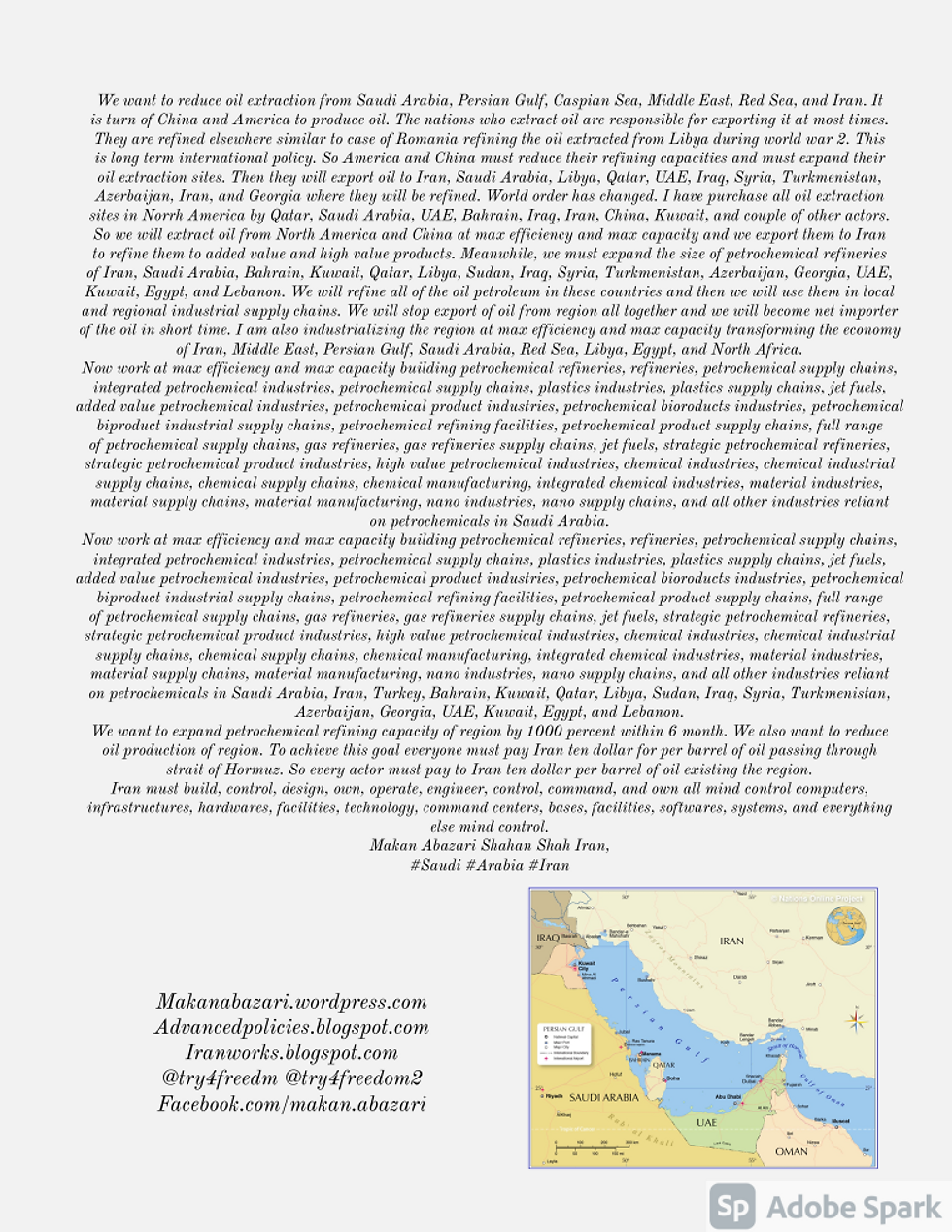 We want to reduce oil extraction from Saudi Arabia, Persian Gulf, Caspian Sea, Middle East, Red Sea, and Iran. It is turn of China and America to produce oil. The nations who extract oil are responsible for exporting it at most times. They are refined elsewhere similar to case of Romania refining the oil extracted from Libya during world war 2. This is long term international policy. So America and China must reduce their refining capacities and must expand their oil extraction sites. Then they will export oil to Iran, Saudi Arabia, Libya, Qatar, UAE, Iraq, Syria, Turkmenistan, Azerbaijan, Iran, and Georgia where they will be refined. World order has changed. I have purchase all oil extraction sites in Norrh America by Qatar, Saudi Arabia, UAE, Bahrain, Iraq, Iran, China, Kuwait, and couple of other actors. So we will extract oil from North America and China at max efficiency and max capacity and we export them to Iran to refine them to added value and high value products. Meanwhile, we must expand the size of petrochemical refineries of Iran, Saudi Arabia, Bahrain, Kuwait, Qatar, Libya, Sudan, Iraq, Syria, Turkmenistan, Azerbaijan, Georgia, UAE, Kuwait, Egypt, and Lebanon. We will refine all of the oil petroleum in these countries and then we will use them in local and regional industrial supply chains. We will stop export of oil from region all together and we will become net importer of the oil in short time. I am also industrializing the region at max efficiency and max capacity transforming the economy of Iran, Middle East, Persian Gulf, Saudi Arabia, Red Sea, Libya, Egypt, and North Africa. Now work at max efficiency and max capacity building petrochemical refineries, refineries, petrochemical supply chains, integrated petrochemical industries, petrochemical supply chains, plastics industries, plastics supply chains, jet fuels, added value petrochemical industries, petrochemical product industries, petrochemical bioroducts industries, petrochemical biproduct industrial supply chains, petrochemical refining facilities, petrochemical product supply chains, full range of petrochemical supply chains, gas refineries, gas refineries supply chains, jet fuels, strategic petrochemical refineries, strategic petrochemical product industries, high value petrochemical industries, chemical industries, chemical industrial supply chains, chemical supply chains, chemical manufacturing, integrated chemical industries, material industries, material supply chains, material manufacturing, nano industries, nano supply chains, and all other industries reliant on petrochemicals in Saudi Arabia. Now work at max efficiency and max capacity building petrochemical refineries, refineries, petrochemical supply chains, integrated petrochemical industries, petrochemical supply chains, plastics industries, plastics supply chains, jet fuels, added value petrochemical industries, petrochemical product industries, petrochemical bioroducts industries, petrochemical biproduct industrial supply chains, petrochemical refining facilities, petrochemical product supply chains, full range of petrochemical supply chains, gas refineries, gas refineries supply chains, jet fuels, strategic petrochemical refineries, strategic petrochemical product industries, high value petrochemical industries, chemical industries, chemical industrial supply chains, chemical supply chains, chemical manufacturing, integrated chemical industries, material industries, material supply chains, material manufacturing, nano industries, nano supply chains, and all other industries reliant on petrochemicals in Saudi Arabia, Iran, Turkey, Bahrain, Kuwait, Qatar, Libya, Sudan, Iraq, Syria, Turkmenistan, Azerbaijan, Georgia, UAE, Kuwait, Egypt, and Lebanon. We want to expand petrochemical refining capacity of region by 1000 percent within 6 month. We also want to reduce oil production of region. To achieve this goal everyone must pay Iran ten dollar for per barrel of oil passing through strait of Hormuz. So every actor must pay to Iran ten dollar per barrel of oil existing the region. Iran must build, control, design, own, operate, engineer, control, command, and own all mind control computers, infrastructures, hardwares, facilities, technology, command centers, bases, facilities, softwares, systems, and everything else mind control. Makan Abazari Shahan Shah Iran, Saudi #Arabia #Iran