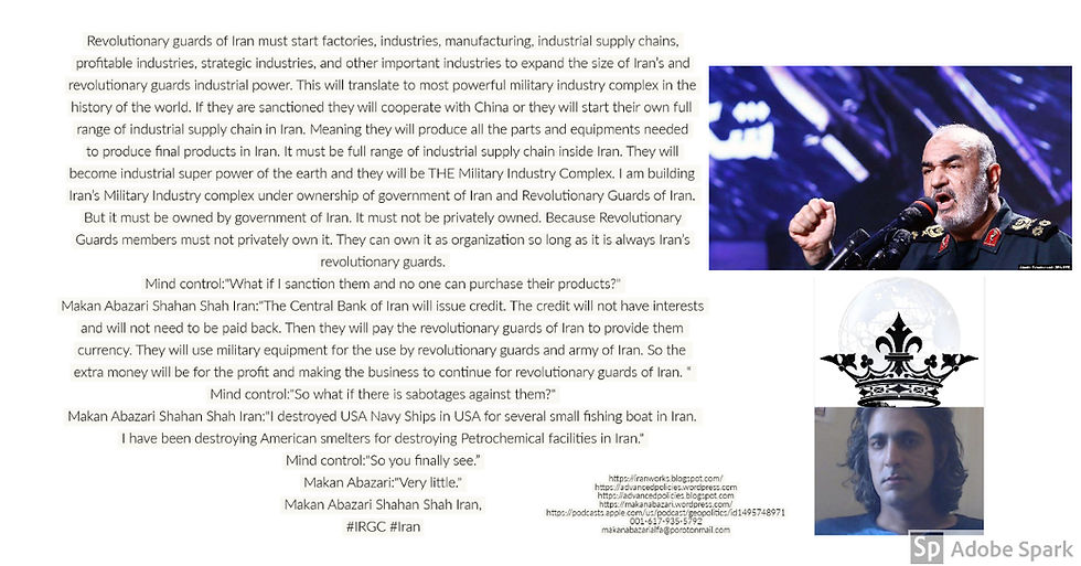 Revolutionary guards of Iran must start factories, industries, manufacturing, industrial supply chains, profitable industries, strategic industries, and other important industries to expand the size of Iran’s and revolutionary guards industrial power. This will translate to most powerful military industry complex in the history of the world. If they are sanctioned they will cooperate with China or they will start their own full range of industrial supply chain in Iran. Meaning they will produce all the parts and equipments needed to produce final products in Iran. It must be full range of industrial supply chain inside Iran. They will become industrial super power of the earth and they will be THE Military Industry Complex. I am building Iran’s Military Industry complex under ownership of government of Iran and Revolutionary Guards of Iran. But it must be owned by government of Iran. It must not be privately owned. Because Revolutionary Guards members must not privately own it. They can own it as organization so long as it is always Iran’s revolutionary guards. Mind control:”What if I sanction them and no one can purchase their products?” Makan Abazari Shahan Shah Iran:”The Central Bank of Iran will issue credit. The credit will not have interests and will not need to be paid back. Then they will pay the revolutionary guards of Iran to provide them currency. They will use military equipment for the use by revolutionary guards and army of Iran. So the extra money will be for the profit and making the business to continue for revolutionary guards of Iran. “ Mind control:”So what if there is sabotages against them?” Makan Abazari Shahan Shah Iran:”I destroyed USA Navy Ships in USA for several small fishing boat in Iran. I have been destroying American smelters for destroying Petrochemical facilities in Iran.” Mind control:”So you finally see.” Makan Abazari:”Very little.”