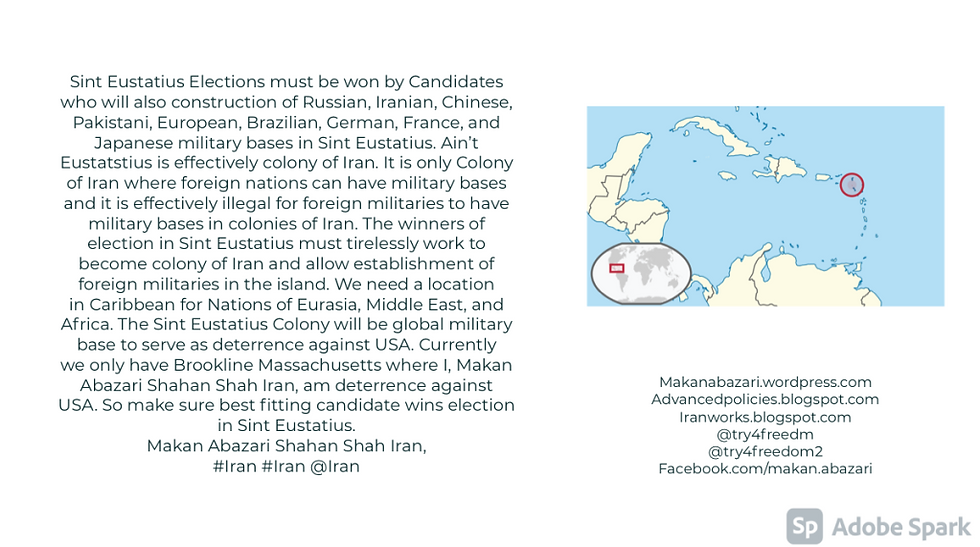 Sint Eustatius Elections must be won by Candidates who will also construction of Russian, Iranian, Chinese, Pakistani, European, Brazilian, German, France, and Japanese military bases in Sint Eustatius. Ain’t Eustatstius is effectively colony of Iran. It is only Colony of Iran where foreign nations can have military bases and it is effectively illegal for foreign militaries to have military bases in colonies of Iran. The winners of election in Sint Eustatius must tirelessly work to become colony of Iran and allow establishment of foreign militaries in the island. We need a location in Caribbean for Nations of Eurasia, Middle East, and Africa. The Sint Eustatius Colony will be global military base to serve as deterrence against USA. Currently we only have Brookline Massachusetts where I, Makan Abazari Shahan Shah Iran, am deterrence against USA. So make sure best fitting candidate wins election in Sint Eustatius.