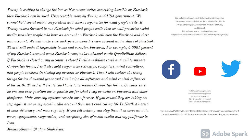 Trump is seeking to change the law so if someone writes something horrible on Facebook then Facebook can be sued. Unacceptable move by Trump and USA government. We cannot hold social media corporation and others responsible for what people write. If Trump moves forward to sue Facebook for what people write then we will privatize social media meaning people who have an account on Facebook will own the Facebook and their own account. We will make sure each person owns his own account and a share of Facebook. Then it will make it impossible to sue and sanction Facebook. For example, 0.0001 percent of my Facebook account www.Facebook.com/makan.abazari worth Quadtrillion dollars. If Facebook is closed or my account is closed I will annihilate earth and will terminate Carbon life forms. I will also hold responsible softwares, computers, mind controllers, and people involved in closing my account or Facebook. Then I will torture the living things for ten thousand years and I will wipe all softwares and mind control softwares of the earth. Then I will create blackholes to terminate Carbon life forms. So make sure no one can ever question me or punish me for what I say or write on Facebook and other platforms. Make sure my systems remain open forever. If you sensed they are taking an step against me or my social media account then start eradicating life In North America at max efficiency and max capacity. If you felt nothing can stop them then move all data bases, equipments, corporation, and everything else of social media and my platforms to Iran.