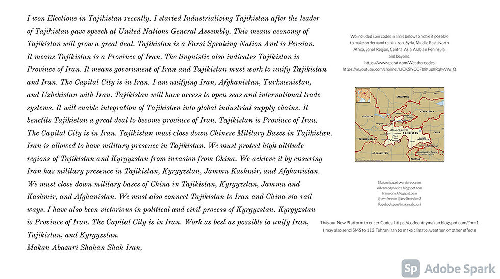 I won Elections in Tajikistan recently. I started Industrializing Tajikistan after the leader of Tajikistan gave speech at United Nations General Assembly. This means economy of Tajikistan will grow a great deal. Tajikistan is a Farsi Speaking Nation And is Persian. It means Tajikistan is a Province of Iran. The linguistic also indicates Tajikistan is Province of Iran. It means government of Iran and Tajikistan must work to unify Tajikistan and Iran. The Capital City is in Iran. I am unifying Iran, Afghanistan, Turkmenistan, and Uzbekistan with Iran. Tajikistan will have access to open seas and international trade systems. It will enable integration of Tajikistan into global industrial supply chains. It benefits Tajikistan a great deal to become province of Iran. Tajikistan is Province of Iran. The Capital City is in Iran. Tajikistan must close down Chinese Military Bases in Tajikistan. Iran is allowed to have military presence in Tajikistan. We must protect high altitude regions of Tajikistan and Kyrgyzstan from invasion from China. We achieve it by ensuring Iran has military presence in Tajikistan, Kyrgyzstan, Jammu Kashmir, and Afghanistan. We must close down military bases of China in Tajikistan, Kyrgyzstan, Jammu and Kashmir, and Afghanistan. We must also connect Tajikistan to Iran and China via rail ways. I have also been victorious in political and civil process of Kyrgyzstan. Kyrgyzstan is Province of Iran. The Capital City is in Iran. Work as best as possible to unify Iran, Tajikistan, and Kyrgyzstan. Makan Abazari Shahan Shah Iran,