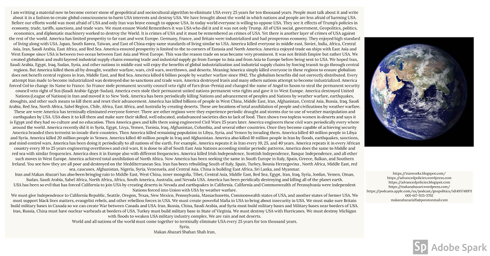 I am writting a material now to become corner stone of geopolitical and sociocultural algorithm to eliminate USA every 25 years for ten thousand years. People must talk about it and write about it in a fashion to create global consciousness to harm USA interests and destroy USA. We have brought about the world in which nations and people are less afraid of harming USA. Before our efforts world was most afraid of USA and only Iran was brave enough to oppose USA. In today world everyone is willing to oppose USA. They see it effects of Trump’s policies in economy, trade, tariffs, sanctions, and trade wars. We must ensure World Remembers it was USA who did it and it was not only Trump. All of USA social, government, Geopolitics, politics, economics, and diplomatic machinery worked to destroy the World. It is crimes of USA and it must be remembered as crimes of USA. Yet there is another layer of crimes of USA against the rest of the world. America has limited prosperity to far east and west Europe. Germany, France, and Britain were industrialized and had prosperous economy. They enjoyed high standard of living along with USA. Japan, South Korea, Taiwan, and East of China enjoy same standards of living similar to USA. America killed everyone in middle east, Soviet, India, Africa, Central Asia, Iran, Saudi Arabia, East Africa, and Red Sea. America ensured prosperity is limited to the to corners of Eurasia and North America. America enjoyed trade on ships with East Asia and West Europe since USA is between two ocean between East Asia and West Europe. This was the reason trade on seas became very prominent. It was not British Empire but rather USA. We created globalism and multi layered industrial supply chains ensuring trade and industrial supply go from Europe to Asia and from Asia to Europe before being sent to USA. We hoped Iran, Saudi Arabia, Egypt, Iraq, Sudan, Syria, and other nations in middle east will enjoy the benefits of global industrialization and industrial supply chains by forcing transit to go through central regions. But America killed them all by drought, weather warfare, wars, civil wars, overthrows, and deserts. Meaning America simply killed everyone in these regions to ensure globalism does not benefit central regions in Iran, Middle East, and Red Sea. America killed 6 billion people by weather warfare since 1942. The globalism benefits did not correctly distributed. Every attempt Iran made to become industrialized was destroyed due to sanctions and trade wars. America destroyed Iran’s and many others nations attempt to become industrialized. America forced Gol to change its Name to France. So France stole permanent security council veto right of Fars (Iran-Persia) and changed the name of Angol to Saxon to steal the permanent security council veto right of Sus (Saudi Arabia-Egypt-Sudan). America even stole their permanent united nations permanent veto rights and gave it to West Europe. America destroyed United Nations (League of Nations) in Iran and moved it to New York. America has been periodically killing Nations and advancement of peoples and Nations by weather warfare, earthquakes, droughts, and other such means to kill them and reset their advancement. America has killed billions of people in West China, Middle East, Iran, Afghanistan, Central Asia, Russia, Iraq, Saudi Arabia, Red Sea, North Africa, Sahel Region, Chile, Africa, East Africa, and Australia by creating deserts. These are locations of total annihilation of people and civilizations by weather warfare. These are were America has terminally eliminated everyone forever. There are other regions were they experience periodic draught and storms due to use of weather manipulation and earthquakes by USA. USA does it to kill them and make sure their skilled, well educated, andadvanced societies dies to lack of food. Then shows two topless women in deserts and says it is Egypt and they had no culture and no education. Then America goes and kills them using engineered Civil Wars 25 years later. America engineers these civil wars periodically every where around the world. America recently did it in Syria, Egypt, Livya, Yemen, Tunisia, Iraq, Afghanistan, Columbia, and several other countries. Once they become capable of achieving security America branded then terrorist to invade their countries. Then America killed remaining population in Libya, Syria, and Yemen by invading them. America killed 40 million people in Libya and Syria. America killed 20 million people in Yemen. America killed 40 million people in Iraq and Afghanistan. America also killed 10 million people in Iran by floods, earthquakes, sanctions, and mind control wars. America has been doing it periodically to all nations of the earth. For example, America repeats it in Iran every 10, 25, and 40 years. America repeats it in every African country every 10 to 25 years engineering overthrows and civil wars. It is done to all of South East Asia Nations according similar periodic patterns. America does the same to Middle and red sea with similar frequencies. America does it in Europe also with different frequencies. America killed Irish Independence, Scottish Independence, Basque Independence, and all other such moves in West Europe. America achieved total annihilation of North Africa. Now America has been seeking the same in South Europe in Italy, Spain, Greece, Balkan, and Southern Ireland. You see how they are all poor and destroyed on the Medditerranean Sea. Iran has been rebuilding South of Italy, Spain, Turkey, Bosnia Herzegovina , North Africa, Middle East, red sea, caucuses, Afghanistan, Nigeria, Syria, Venezuela, and Central Asia. China is building East Africa, Sri Lanka, and Myanmar. Iran and Makan Abazari has also been bringing rain to Middle East, West China, inner mongolia, Tibet, Central Asia, Middle East, Red Sea, Egypt, Iran, Iraq, Syria, Jordan, Yemen, Oman, Sudan, Saudi Arabia, Sahel Africa, North Africa, Africa, South America, Australia, 
