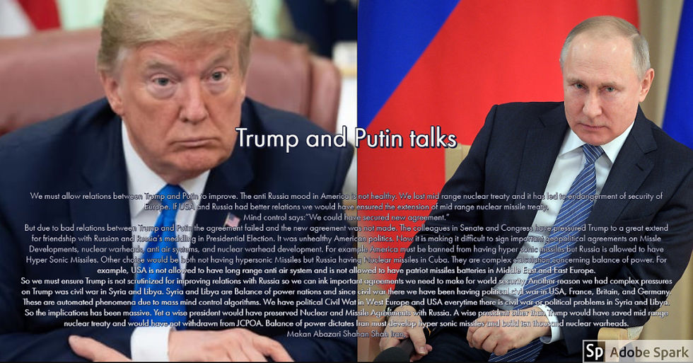 We must allow relations between Trump and Putin to improve. The anti Russia mood in America is not healthy. We lost mid range nuclear treaty and it has led to endangerment of security of Europe. If USA and Russia had better relations we would have ensured the extension of mid range nuclear missile treaty. Mind control says:”We could have secured new agreement.” But due to bad relations between Trump and Putin the agreement failed and the new agreement was not made. The colleagues in Senate and Congress have pressured Trump to a great extend for friendship with Russian and Russia’s meddling in Presidential Election. It was unhealthy American politics. Now it is making it difficult to sign important geopolitical agreements on Missle Developments, nuclear warheads, anti air systems, and nuclear warhead development. For example America must be banned from having hyper sonic missiles but Russia is allowed to have Hyper Sonic Missiles. Other choice would be both not having hypersonic Missiles but Russia having Nuclear missiles in Cuba. They are complex calculation concerning balance of power. For example, USA is not allowed to have long range anti air system and is not allowed to have patriot missiles batteries in Middle East and East Europe. So we must ensure Trump is not scrutinized for improving relations with Russia so we can ink important agreements we need to make for world security. Another reason we had complex pressures on Trump was civil war in Syria and Libya. Syria and Libya are Balance of power nations and since civil war there we have been having political civil war in USA, France, Britain, and Germany. These are automated phenomena due to mass mind control algorithms. We have political Civil Wat in West Europe and USA everytime there is civil war or political problems in Syria and Libya. So the implications has been massive. Yet a wise president would have preserved Nuclear and Missile Agreements with Russia. A wise president other than Trump would have saved mid range nuclear treaty and would have not withdrawn from JCPOA. Balance of power dictates Iran must develop hyper sonic missiles and build ten thousand nuclear warheads.