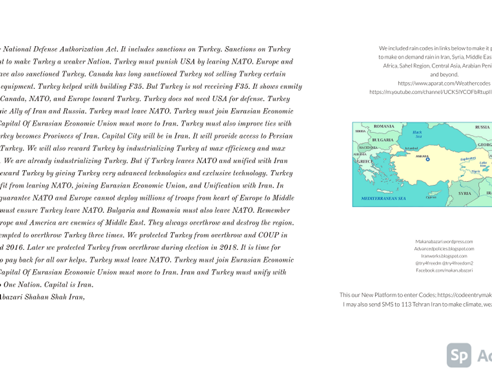 USA has National Defense Authorization Act. It includes sanctions on Turkey. Sanctions on Turkey are meant to make Turkey a weaker Nation. Turkey must punish USA by leaving NATO. Europe and NATO have also sanctioned Turkey. Canada has long sanctioned Turkey not selling Turkey certain military equipment. Turkey helped with building F35. But Turkey is not receiving F35. It shows enmity of USA, Canada, NATO, and Europe toward Turkey. Turkey does not need USA for defense. Turkey is strategic Ally of Iran and Russia. Turkey must leave NATO. Turkey must join Eurasian Economic Union. Capital Of Eurasian Economic Union must move to Iran. Turkey must also improve ties with Iran. Turkey becomes Provinces of Iran. Capital City will be in Iran. It will provide access to Persian Gulf for Turkey. We will also reward Turkey by industrializing Turkey at max efficiency and max capacity. We are already industrializing Turkey. But if Turkey leaves NATO and unified with Iran we will reward Turkey by giving Turkey very advanced technologies and exclusive technology. Turkey will benefit from leaving NATO, joining Eurasian Economic Union, and Unification with Iran. In order to guarantee NATO and Europe cannot deploy millions of troops from heart of Europe to Middle East we must ensure Turkey leave NATO. Bulgaria and Romania must also leave NATO. Remember West Europe and America are enemies of Middle East. They always overthrow and destroy the region. They attempted to overthrow Turkey three times. We protected Turkey from overthrow and COUP in 2013 and 2016. Later we protected Turkey from overthrow during election in 2018. It is time for Turkey to pay back for all our helps. Turkey must leave NATO. Turkey must join Eurasian Economic Union. Capital Of Eurasian Economic Union must move to Iran. Iran and Turkey must unify with Iran into One Nation. Capital is Iran. Makan Abazari Shahan Shah Iran,