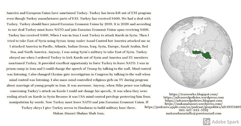 America and European Union have sanctioned Turkey. Turkey has been left out of F35 program even though Turkey manufactures parts of F35. Turkey has received S400. We had a deal with Turkey. Turkey should have joined Eurasian Economic Union by 2019. It is 2020 and according to our deal Turkey must leave NATO and join Eurasian Economic Union upon receiving S400. Turkey has received S400. When I was in Iran I sent Turkey to attack Kurds in Syria. Then I tried to take East of Syria using Syrian Army under Assad Control but America attacked me so I attacked America in Pacific, Atlantic, Indian Ocean, Iraq, Syria, Europe, Saudi Arabia, Red Sea, and North America. Anyway, I was using Syria’s military to take East of Syria. Turkey obeyed me when I ordered Turkey to kick Kurds out of Syria and America and EU members sanctioned Turkey. It provided excellent opportunity to force Turkey to leave NATO. I was in prison camp in Iran and I could change the speech of Trump by talking to the wall. Mind control was listening. I also changed Ukraine gate investigation in Congress by talking to the wall when mind control was listening. I also mass mind controlled religious girls on TV during program about marriage of young people in Iran. It was awesome. Anyway, when Mike pence was talking concerning Turkey’s attack on Kurds I could not change his speech.. It was when they were ending attack on Kurds in Syria Because it was USA mind control privilege protecting him from manipulation by words. Now Turkey must leave NATO and join Eurasian Economic Union. If Turkey obeys I give Turkey access to Honduras to build military base there. Makan Abazari Shahan Shah Iran,