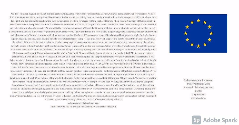 We don’t want Far Right and Neo Nazi Political Parties wining in today European Parliamentary Election. We must defeat them whenever possible. We also don’t want Populists. We are not against all Populist Parties but we are specially against anti Immigrant Political Parties in Europe. To claify we find centrists, Far Right, and Populist parties each having their own dangers. We stand for classic Political Parties of Europe whom have lost majority of their support. In order to ensure the European Experiment is successful we must ensure Classic Left, Right, and Centrist Parties win the election. We always win all elections out right with near absolute majority. We know it is the era when our support of Classic Parties may not bring the near absolute Majority Victory but we risk it to ensure the survival of European Experiments and Classic Voices. They were trained and were skilled in upholding values and policy vital to world security and advancement of Europe. It always made situations manageable. Until era of Trump create waves of Fascisms and immigrants brought Far Right. But we support migrants and they must become part of Sociocultural fabric of Europe. They must recieve all support and help to prevent their Genocide. Because algorithms of Europe engineers far rights and fascists every 70 years to do genocide and we are about same point of history. So we master gather all our forces to oppose anti migriant, Far Right, and Populist parties in European Union. For our European Values prevent us from allowing genocidal tendencies to take root in our societies in our Continent. This automated Algorithm every seventy years. We must also ensure Italy leaves Eurozone and hopefully joins Mediterranean Economic Union with membership of West Asia, North Africa, and South Europe Members. The Capital City Of Mediterranean Union is permanently in Iran. This is one most successful and powerful near recent Empires and Geopolitical systems ever existed second to Iran Systems. It will bring about era of prosperity in South Europe where they suffer from long term austerity measures. It will create New Regional and Global Industrial Supply Chains. I have developed and Industrialized South of Italy for this purpose and they have 9.9 GDP growth this year when every other Nation in Europe has contracted. We also must make sure the relations Between European Union with Iran improves and Becomes permanent Strategic Alliance. Member States must improve relations with Iran. Iran must build military bases in couple of European Nations but the location is out of this topic. We must all leave NATO. We must close USA military bases. For USA is from across ocean while we are all Eurasia. We must also work on improving PESCO European Military and gain independence from USA for Defense of Europe. We had worked for forty years until we created PESCO European Military in 2018. We have been working for two years to fully separate it from NATO so it will replace NATO for security of Europe. We have been working very hard with the help of European Commission, Germany, and France to gain political, diplomatic, geopolitics, and industrial independence from United States of America. China and Iran offered us substantial help in gaining economic and industrial independence from USA to weather harsh economic climate of trade war during Trump era. Russia had also helped. Iran also helped us to ensure our military industry complex and manufacturing to continue production so we remained a major military industry. I also sold lots of European Weapons to Persian Gulf Nations. We must sell substantial amount advanced and high tech military equipment to Iran so we can ensure security of Iran and survival of Europe’s military industry. Makan Abazari Shahan Shah Iran, #Iran #Europe #EU #European #Parliament #Commission #Election
