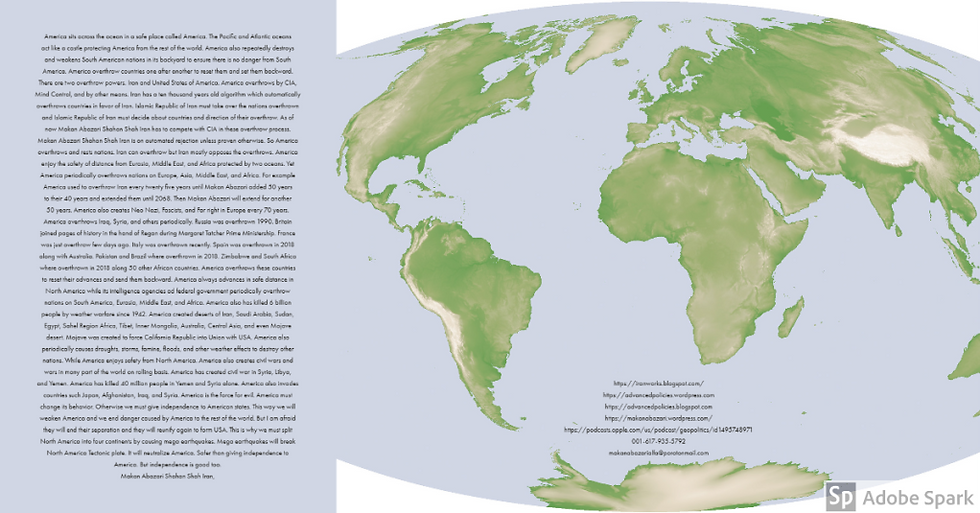 America sits across the ocean in a safe place called America. The Pacific and Atlantic oceans act like a castle protecting America from the rest of the world. America also repeatedly destroys and weakens South American nations in its backyard to ensure there is no danger from South America. America overthrow countries one after another to reset them and set them backward. There are two overthrow powers. Iran and United States of America. America overthrows by CIA, Mind Control, and by other means. Iran has a ten thousand years old algorithm which automatically overthrows countries in favor of Iran. Islamic Republic of Iran must take over the nations overthrown and Islamic Republic of Iran must decide about countries and direction of their overthrow. As of now Makan Abazari Shahan Shah Iran has to compete with CIA in these overthrow process. Makan Abazari Shahan Shah Iran is on automated rejection unless proven otherwise. So America overthrows and rests nations. Iran can overthrow but Iran mostly opposes the overthrows. America enjoy the safety of distance from Eurasia, Middle East, and Africa protected by two oceans. Yet America periodically overthrows nations on Europe, Asia, Middle East, and Africa. For example America used to overthrow Iran every twenty five years until Makan Abazari added 50 years to their 40 years and extended them until 2068. Then Makan Abazari will extend for another 50 years. America also creates Neo Nazi, Fascists, and Far right in Europe every 70 years. America overthrows Iraq, Syria, and others periodically. Russia was overthrown 1990. Britain joined pages of history in the hand of Regan during Margaret Tatcher Prime Ministership. France was just overthrow few days ago. Italy was overthrown recently. Spain was overthrown in 2018 along with Australia. Pakistan and Brazil where overthrown in 2018. Zimbabwe and South Africa where overthrown in 2018 along 50 other African countries. America overthrows these countries to reset their advances and send them backward. America always advances in safe distance in North America while its intelligence agencies ad federal government periodically overthrow nations on South America, Eurasia, Middle East, and Africa. America also has killed 6 billion people by weather warfare since 1942. America created deserts of Iran, Saudi Arabia, Sudan, Egypt, Sahel Region Africa, Tibet, Inner Mongolia, Australia, Central Asia, and even Mojave desert. Mojave was created to force California Republic into Union with USA. America also periodically causes draughts, storms, famine, floods, and other weather effects to destroy other nations. While America enjoys safety from North America. America also creates civil wars and wars in many part of the world on rolling basis. America has created civil war in Syria, Libya, and Yemen. America has killed 40 million people in Yemen and Syria alone. America also invades countries such Japan, Afghanistan, Iraq, and Syria. America is the force for evil. America must change its behavior. Otherwise we must give independence to American states. This way we will weaken America and we end danger caused by America to the rest of the world. But I am afraid they will end their separation and they will reunify again to form USA. This is why we must split North America into four continents by causing mega earthquakes. Mega earthquakes will break North America Tectonic plate. It will neutralize America. Safer than giving independence to America. But independence is good too.Makan Abazari Shahan Shah Iran,#Iran#USA#Weather#Overthrow#CIA#South#America