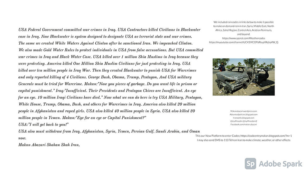 USA Federal Government committed war crimes in Iraq. USA Contractors killed Civilians in Blackwater case in Iraq. Now Blackwater is system designed to designate USA as terrorist state and war crimes. The same we created White Waters Against Clinton after he sanctioned Iran. We impeached Clinton. We also made Gold Water Rules to protect individuals in USA from false accusations. But USA committed war crimes in Iraq and Black Water Case. USA killed over 1 million Shia Muslims in Iraq because they were protesting. America killed One Million Shia Muslim Civilians for just protesting in Iraq. USA killed over ten million people in Iraq War. Then they created Blackwater to punish USA for Warcrimes and only reported killing of 4 Civilians. George Bush, Obama, Trump, Pentagon, And USA military Generals must be tried for Warcrime. Makan:”Now you pieces of garbage. Do you want life in prison or capital punishment.” Iraq:”Insufficient. Their Presidents and Pentagon Chives are Insufficient. An eye for an eye. 10 million Iraqi Civilians have died.” Now what we can do here is try USA Military, Pentagon, White House, Trump, Obama, Bush, and others for Warcrimes in Iraq. America also killed 20 million people in Afghanistan and raped girls. USA also killed 40 million people in Syria. USA also killed 20 million people in Yemen. Makan:”Eye for an eye or Capital Punishment?” USA:”I will get back to you!” USA also must withdraw from Iraq, Afghanistan, Syria, Yemen, Persian Gulf, Saudi Arabia, and Oman now. Makan Abazari Shahan Shah Iran,