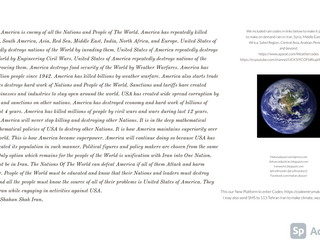 United States of America is enemy of all the Nations and People of The World. America has repeatedly killed People in Africa, South America, Asia, Red Sea, Middle East, India, North Africa, and Europe. United States of America repeatedly destroys nations of the World by invading them. United States of America repeatedly destroys nations of the World by Engineering Civil Wars. United States of America repeatedly destroys nations of the World by overthrowing them. America destroys food security of the World by Weather Warfares. America has killed over 10 billion people since 1942. America has killed billions by weather warfare. America also starts trade wars. Trade wars destroys hard work of Nations and People of the World. Sanctions and tariffs have created difficulty for businesses and industries to stay open around the world. USA has created wide spread corruption by enforcing tariffs and sanctions on other nations. America has destroyed economy and hard work of billions of people during last 4 years. America has killed millions of people by civil wars and wars during last 12 years. United States of America will never stop killing and destroying other Nations. It is in the deep mathematical politics and mathematical policies of USA to destroy other Nations. It is how America maintains superiority over the rest of the World. This is how America became superpower. America will continue doing so because USA has trained and educated its population in such manner. Political figures and policy makers are chosen from the same kind of people. Only option which remains for the people of the World is unification with Iran into One Nation. Capital City must be in Iran. The Nations Of The World can defeat America if all of them Attack and harm America together. People of the World must be educated and know that their Nations and leaders must destroy USA. Nations and all the people must know the source of all of their problems is United States of America. They must ally with Iran while engaging in activities against USA.