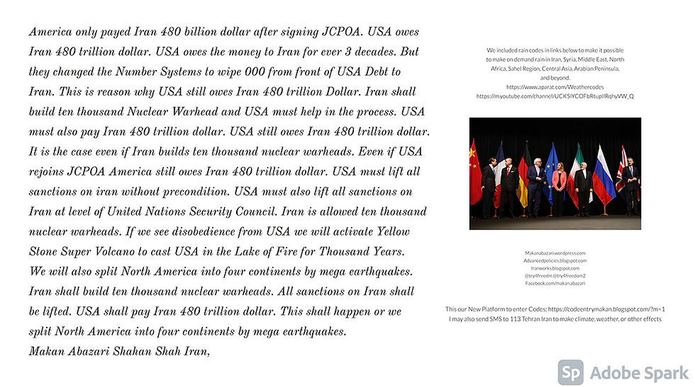 America only payed Iran 480 billion dollar after signing JCPOA. USA owes Iran 480 trillion dollar. USA owes the money to Iran for ever 3 decades. But they changed the Number Systems to wipe 000 from front of USA Debt to Iran. This is reason why USA still owes Iran 480 trillion Dollar. Iran shall build ten thousand Nuclear Warhead and USA must help in the process. USA must also pay Iran 480 trillion dollar. USA still owes Iran 480 trillion dollar. It is the case even if Iran builds ten thousand nuclear warheads. Even if USA rejoins JCPOA America still owes Iran 480 trillion dollar. USA must lift all sanctions on iran without precondition. USA must also lift all sanctions on Iran at level of United Nations Security Council. Iran is allowed ten thousand nuclear warheads. If we see disobedience from USA we will activate Yellow Stone Super Volcano to cast USA in the Lake of Fire for Thousand Years. We will also split North America into four continents by mega earthquakes. Iran shall build ten thousand nuclear warheads. All sanctions on Iran shall be lifted. USA shall pay Iran 480 trillion dollar. This shall happen or we split North America into four continents by mega earthquakes. Makan Abazari Shahan Shah Iran,