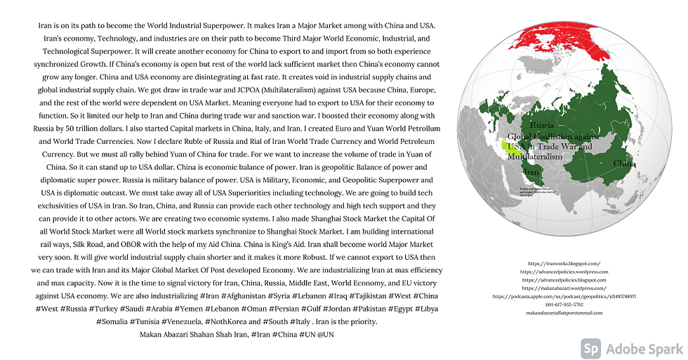 Iran is on its path to become the World Industrial Superpower. It makes Iran a Major Market among with China and USA. Iran’s economy, Technology, and industries are on their path to become Third Major World Economic, Industrial, and Technological Superpower. It will create another economy for China to export to and import from so both experience synchronized Growth. If China’s economy is open but rest of the world lack sufficient market then China’s economy cannot grow any longer. China and USA economy are disintegrating at fast rate. It creates void in industrial supply chains and global industrial supply chain. We got draw in trade war and JCPOA (Multilateralism) against USA because China, Europe, and the rest of the world were dependent on USA Market. Meaning everyone had to export to USA for their economy to function. So it limited our help to Iran and China during trade war and sanction war. I boosted their economy along with Russia by 50 trillion dollars. I also started Capital markets in China, Italy, and Iran. I created Euro and Yuan World Petrollum and World Trade Currencies. Now I declare Ruble of Russia and Rial of Iran World Trade Currency and World Petroleum Currency. But we must all rally behind Yuan of China for trade. For we want to increase the volume of trade in Yuan of China. So it can stand up to USA dollar. China is economic balance of power. Iran is geopolitic Balance of power and diplomatic super power. Russia is military balance of power. USA is Military, Economic, and Geopolitic Superpower and USA is diplomatic outcast. We must take away all of USA Superiorities including technology. We are going to build tech exclusivities of USA in Iran. So Iran, China, and Russia can provide each other technology and high tech support and they can provide it to other actors. We are creating two economic systems. I also made Shanghai Stock Market the Capital Of all World Stock Market were all World stock markets synchronize to Shanghai Stock Market. I am building international rail ways, Silk Road, and OBOR with the help of my Aid China. China is King’s Aid. Iran shall become world Major Market very soon. It will give world industrial supply chain shorter and it makes it more Robust. If we cannot export to USA then we can trade with Iran and its Major Global Market Of Post developed Economy. We are industrializing Iran at max efficiency and max capacity. Now it is the time to signal victory for Iran, China, Russia, Middle East, World Economy, and EU victory against USA economy. We are also industrializing #Iran#Afghanistan#Syria#Lebanon#Iraq#Tajikistan#West#China#West#Russia#Turkey#Saudi#Arabia#Yemen#Lebanon#Oman#Persian#Gulf#Jordan#Pakistan#Egypt#Libya#Somalia#Tunisia#Venezuela, #NothKorea and #South#Italy . Iran is the priority.Makan Abazari Shahan Shah Iran, #Iran#China #UN @UN
